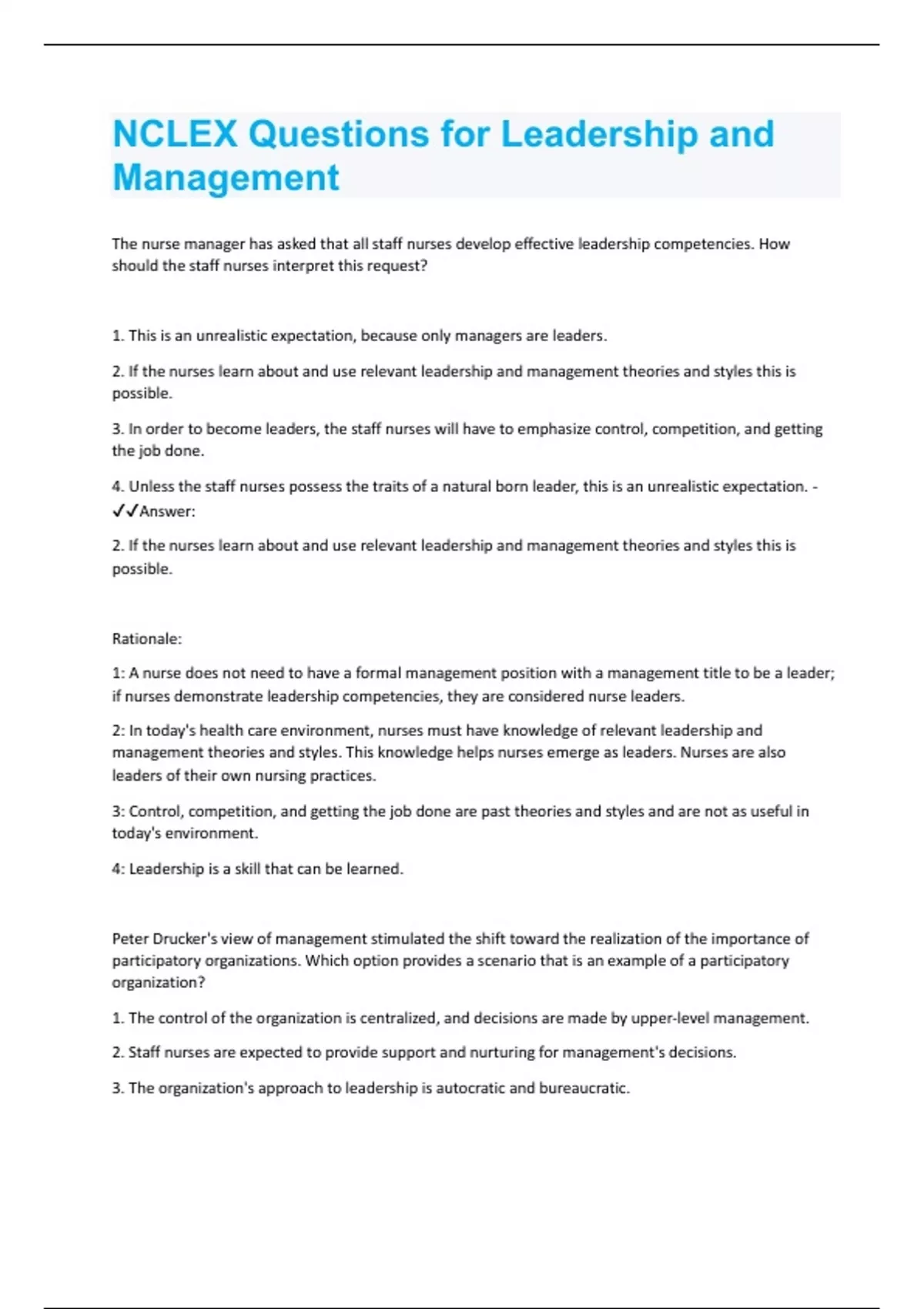 The nurse manager has asked that all staff nurses develop effective leadership competencies. How should the staff nurses interpret this request? 1. This is an unrealistic expectation, because only managers are leaders. 2. If the nurses learn about and use relevant leadership and management theories and styles this is possible. 3. In order to become leaders, the staff nurses will have to emphasize control, competition, and getting the job done. 4. Unless the staff nurses possess the traits of a natural born leader, this is an unrealistic expectation. - Answer: 2. If the nurses learn about and use relevant leadership and management theories and styles this is possible. Rationale: 1: A nurse does not need to have a formal management position with a management title to be a leader; if nurses demonstrate leadership competencies, they are considered nurse leaders. 2: In today's health care environment, nurses must have knowledge of relevant leadership and management theories and styles. This knowledge helps nurses emerge as leaders. Nurses are also leaders of their own nursing practices. 3: Control, competition, and getting the job done are past theories and styles and are not as useful in today's environment. 4: Leadership is a skill that can be learned. Peter Drucker's view of management stimulated the shift toward the realization of the importance of participatory organizations. Which option provides a scenario that is an example of a participatory organization? 1. The control of the organization is centralized, and decisions are made by upper-level management. 2. Staff nurses are expected to provide support and nurturing for management's decisions. 3. The organization's approach to leadership is autocratic and bureaucratic.4. Staff nurses provide input into planning and changes for their own unit. - Answer: