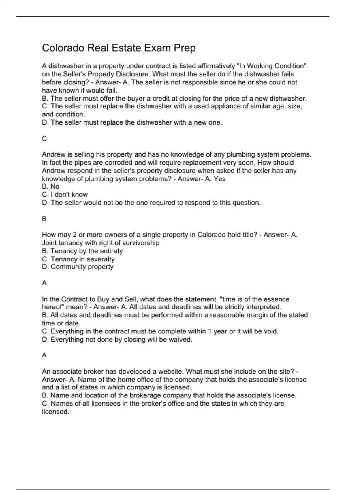 A dishwasher in a property under contract is listed affirmatively "In Working Condition" on the Seller's Property Disclosure. What must the seller do if the dishwasher fails before closing? - Answer- A. The seller is not responsible since he or she could not have known it would fail. B. The seller must offer the buyer a credit at closing for the price of a new dishwasher. C. The seller must replace the dishwasher with a used appliance of similar age, size, and condition. D. The seller must replace the dishwasher with a new one. C Andrew is selling his property and has no knowledge of any plumbing system problems. In fact the pipes are corroded and will require replacement very soon. How should Andrew respond in the seller's property disclosure when asked if the seller has any knowledge of plumbing system problems? - Answer- A. Yes B. No C. I don't know D. The seller would not be the one required to respond to this question. B How may 2 or more owners of a single property in Colorado hold title? - Answer- A. Joint tenancy with right of survivorship B. Tenancy by the entirety C. Tenancy in severalty D. Community property A In the Contract to Buy and Sell, what does the statement, "time is of the essence hereof" mean? - Answer- A. All dates and deadlines will be strictly interpreted. B. All dates and deadlines must be performed within a reasonable margin of the stated time or date. C. Everything in the contract must be complete within 1 year or it will be void. D. Everything not done by closing will be waived. A An associate broker has developed a website. What must she include on the site? - Answer- A. Name of the home office of the company that holds the associate's license and a list of states in which company is licensed. B. Name and location of the brokerage company that holds the associate's license. C. Names of all licensees in the broker's office and the states in which they are licensed. D. License number of the brokerage and a list of current active licensees. B