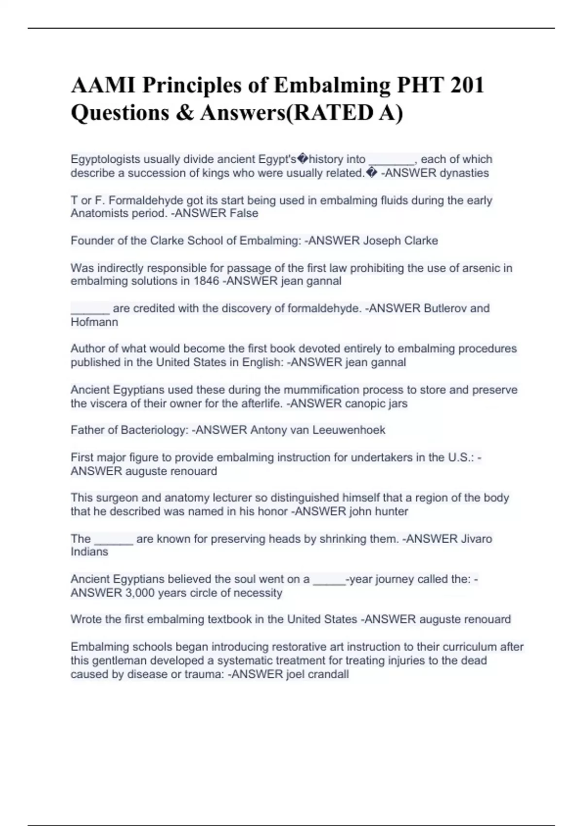 Egyptologists usually divide ancient Egypt's�history into _______, each of which describe a succession of kings who were usually related.� -ANSWER dynasties T or F. Formaldehyde got its start being used in embalming fluids during the early Anatomists period. -ANSWER False Founder of the Clarke School of Embalming: -ANSWER Joseph Clarke Was indirectly responsible for passage of the first law prohibiting the use of arsenic in embalming solutions in 1846 -ANSWER jean gannal ______ are credited with the discovery of formaldehyde. -ANSWER Butlerov and Hofmann Author of what would become the first book devoted entirely to embalming procedures published in the United States in English: -ANSWER jean gannal Ancient Egyptians used these during the mummification process to store and preserve the viscera of their owner for the afterlife. -ANSWER canopic jars Father of Bacteriology: -ANSWER Antony van Leeuwenhoek First major figure to provide embalming instruction for undertakers in the U.S.: -ANSWER auguste renouard AAMI Principles of Embalming PHT 201 Questions & Answers(RATED A)AAMI Principles of Embalming PHT 201 Questions & Answers(RATED A)