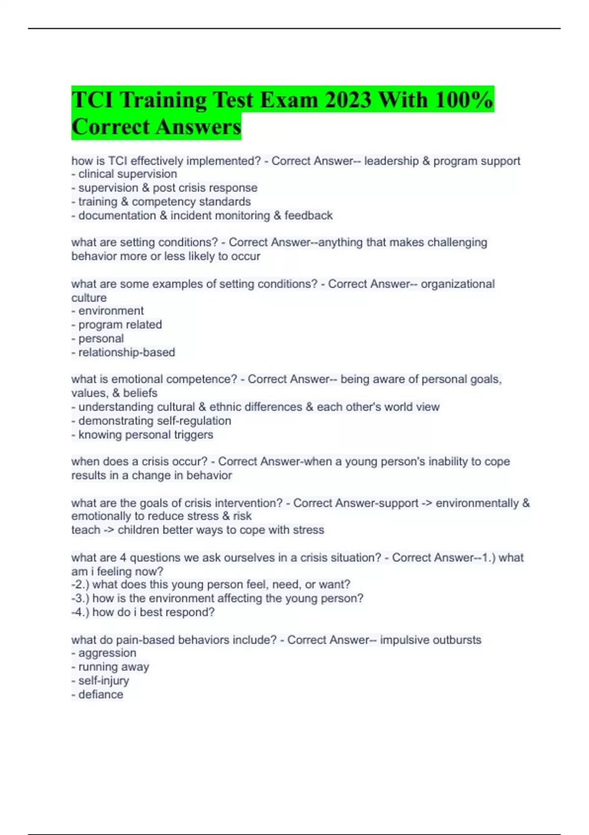 TCI Training Test Exam 2023 With 100% Correct Answers