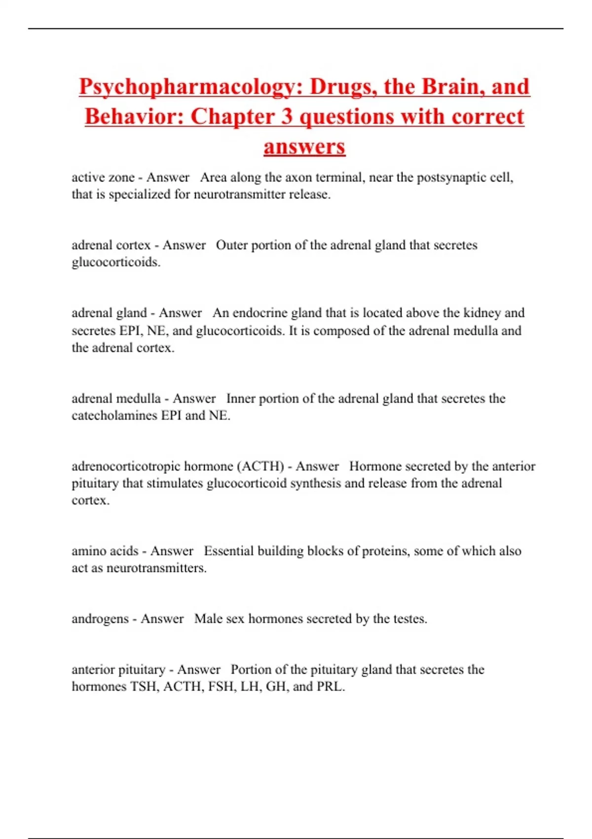 active zone - Answer Area along the axon terminal, near the postsynaptic cell, that is specialized for neurotransmitter release. adrenal cortex - Answer Outer portion of the adrenal gland that secretes glucocorticoids. adrenal gland - Answer An endocrine gland that is located above the kidney and secretes EPI, NE, and glucocorticoids. It is composed of the adrenal medulla and the adrenal cortex. adrenal medulla - Answer Inner portion of the adrenal gland that secretes the catecholamines EPI and NE. adrenocorticotropic hormone (ACTH) - Answer Hormone secreted by the anterior pituitary that stimulates glucocorticoid synthesis and release from the adrenal cortex. amino acids - Answer Essential building blocks of proteins, some of which also act as neurotransmitters. androgens - Answer Male sex hormones secreted by the testes. anterior pituitary - Answer Portion of the pituitary gland