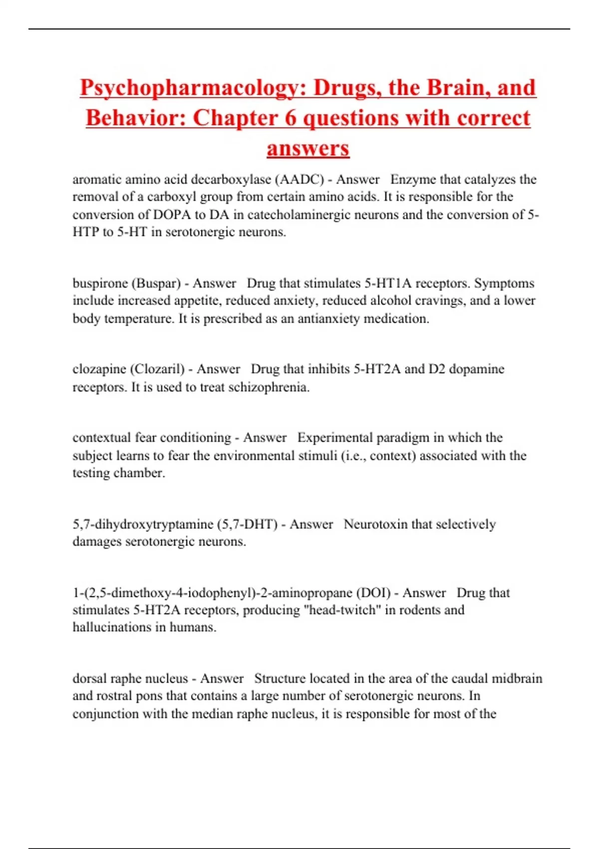 aromatic amino acid decarboxylase (AADC) - Answer Enzyme that catalyzes the removal of a carboxyl group from certain amino acids. It is responsible for the conversion of DOPA to DA in catecholaminergic neurons and the conversion of 5-HTP to 5-HT in serotonergic neurons. buspirone (Buspar) - Answer Drug that stimulates 5-HT1A receptors. Symptoms include increased appetite, reduced anxiety, reduced alcohol cravings, and a lower body temperature. It is prescribed as an antianxiety medication. clozapine (Clozaril) - Answer Drug that inhibits 5-HT2A and D2 dopamine receptors. It is used to treat schizophrenia. contextual fear conditioning - Answer Experimental paradigm in which the subject learns to fear the environmental stimuli (i.e., context) associated with the testing chamber. 5,7-dihydroxytryptamine (5,7-DHT) - Answer Neurotoxin that selectively damages serotonergic neurons. 1-(2,5-dimethoxy-4-iodophenyl)-2-aminopropane (DOI) - Answer Drug that stimulates 5-HT2A receptors, producing "head-twitch" in rodents and hallucinations in humans.