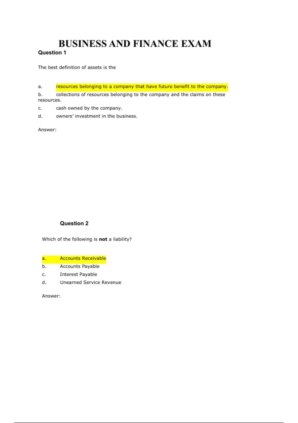 Question 1 The best definition of assets is the a. resources belonging to a company that have future benefit to the company. b. collections of resources belonging to the company and the claims on these resources. c. cash owned by the company. d. owners’ investment in the business. Answer: Question 2 Which of the following is not a liability? a. Accounts Receivable b. Accounts Payable c. Interest Payable d. Unearned Service Revenue Answer:Question 3 Which of the following financial statements is divided into major categories of operating, investing, and financing activities? a. The income statement. b. The balance sheet. c. The statement of cash flows. d. The retained earnings statement. Answer: