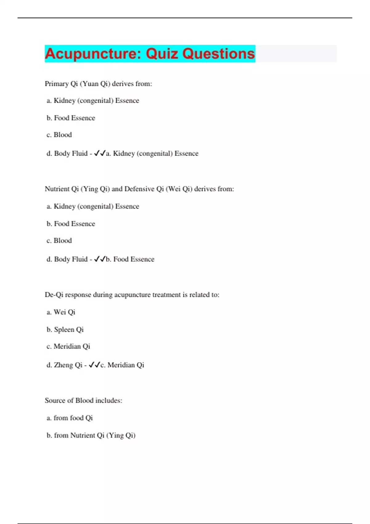 Primary Qi (Yuan Qi) derives from: a. Kidney (congenital) Essence b. Food Essence c. Blood d. Body Fluid - a. Kidney (congenital) Essence Nutrient Qi (Ying Qi) and Defensive Qi (Wei Qi) derives from: a. Kidney (congenital) Essence b. Food Essence c. Blood d. Body Fluid - b. Food Essence De-Qi response during acupuncture treatment is related to: a. Wei Qi b. Spleen Qi c. Meridian Qi d. Zheng Qi - c. Meridian Qi Source of Blood includes: a. from food Qi b. from Nutrient Qi (Ying Qi)