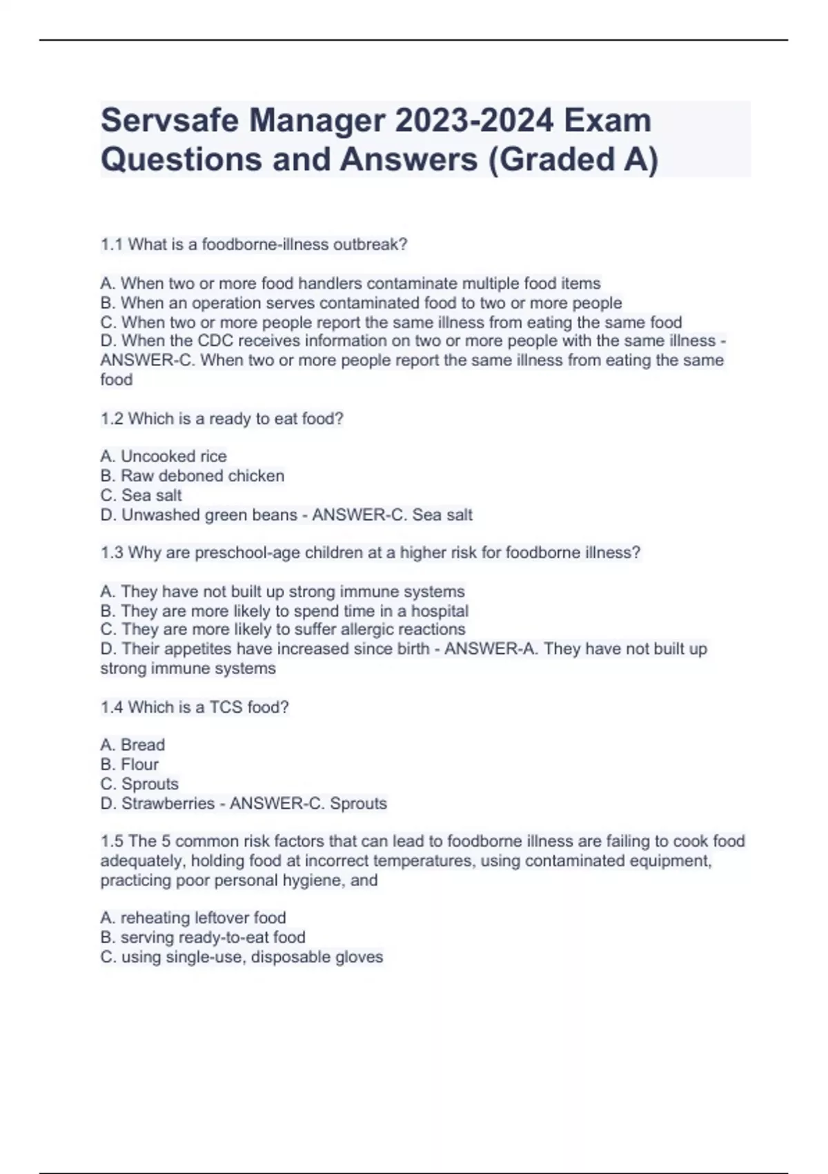 Servsafe Manager Exam Questions and Answers (Graded A) Servsafe Manager Exam Questions and Answers (Graded A) Servsafe Manager Exam Questions and Answers (Graded A) Servsafe Manager Exam Questions and Answers (Graded A) 1.1 What is a foodborne-illness outbreak? A. When two or more food handlers contaminate multiple food items B. When an operation serves contaminated food to two or more people C. When two or more people report the same illness from eating the same food D. When the CDC receives information on two or more people with the same illness - ANSWER-C. When two or more people report the same illness from eating the same food 1.2 Which is a ready to eat food? A. Uncooked rice B. Raw deboned chicken C. Sea salt D. Unwashed green beans - ANSWER-C. Sea salt 1.3 Why are preschool-age children at a higher risk for foodborne illness? A. They have not built up strong immune systems B. They are more likely to spend time in a hospital C. They are more likely to suffer allergic reactions D. Their appetites have increased since birth - ANSWER-A. They have not built up strong immune systems 1.4 Which is a TCS food? A. Bread B. Flour C. Sprouts D. Strawberries - ANSWER-C. Sprouts 1.5 The 5 common risk factors that can lead to foodborne illness are failing to cook food adequately, holding food at incorrect temperatures, using contaminated equipment, practicing poor personal hygiene, and A. reheating leftover food B. serving ready-to-eat food C. using single-use, disposable gloves
