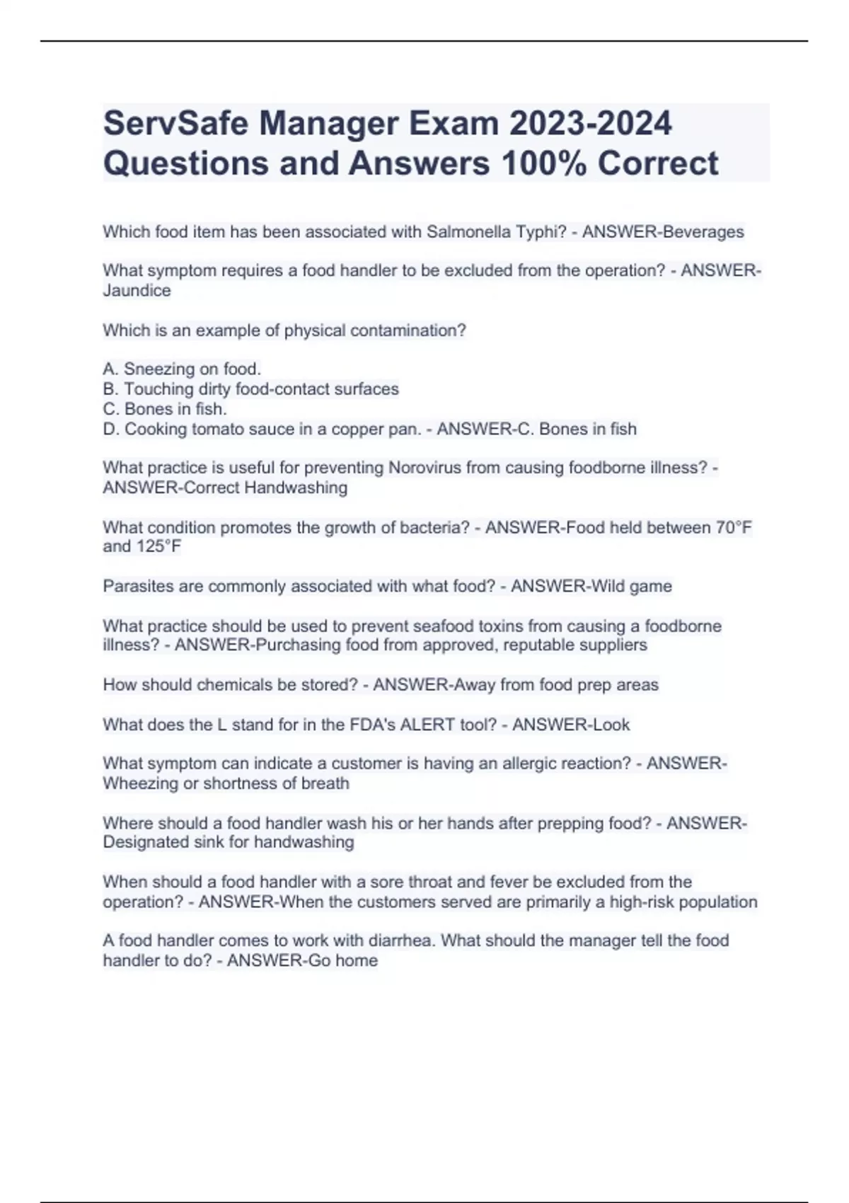 ServSafe Manager Exam Questions and Answers 100% CorrectServSafe Manager Exam Questions and Answers 100% CorrectServSafe Manager Exam Questions and Answers 100% CorrectServSafe Manager Exam Questions and Answers 100% Correct Which food item has been associated with Salmonella Typhi? - ANSWER-Beverages What symptom requires a food handler to be excluded from the operation? - ANSWER-Jaundice Which is an example of physical contamination? A. Sneezing on food. B. Touching dirty food-contact surfaces C. Bones in fish. D. Cooking tomato sauce in a copper pan. - ANSWER-C. Bones in fish What practice is useful for preventing Norovirus from causing foodborne illness? - ANSWER-Correct Handwashing What condition promotes the growth of bacteria? - ANSWER-Food held between 70°F and 125°F Parasites are commonly associated with what food? - ANSWER-Wild game What practice should be used to prevent seafood toxins from causing a foodborne illness? - ANSWER-Purchasing food from approved, reputable suppliers