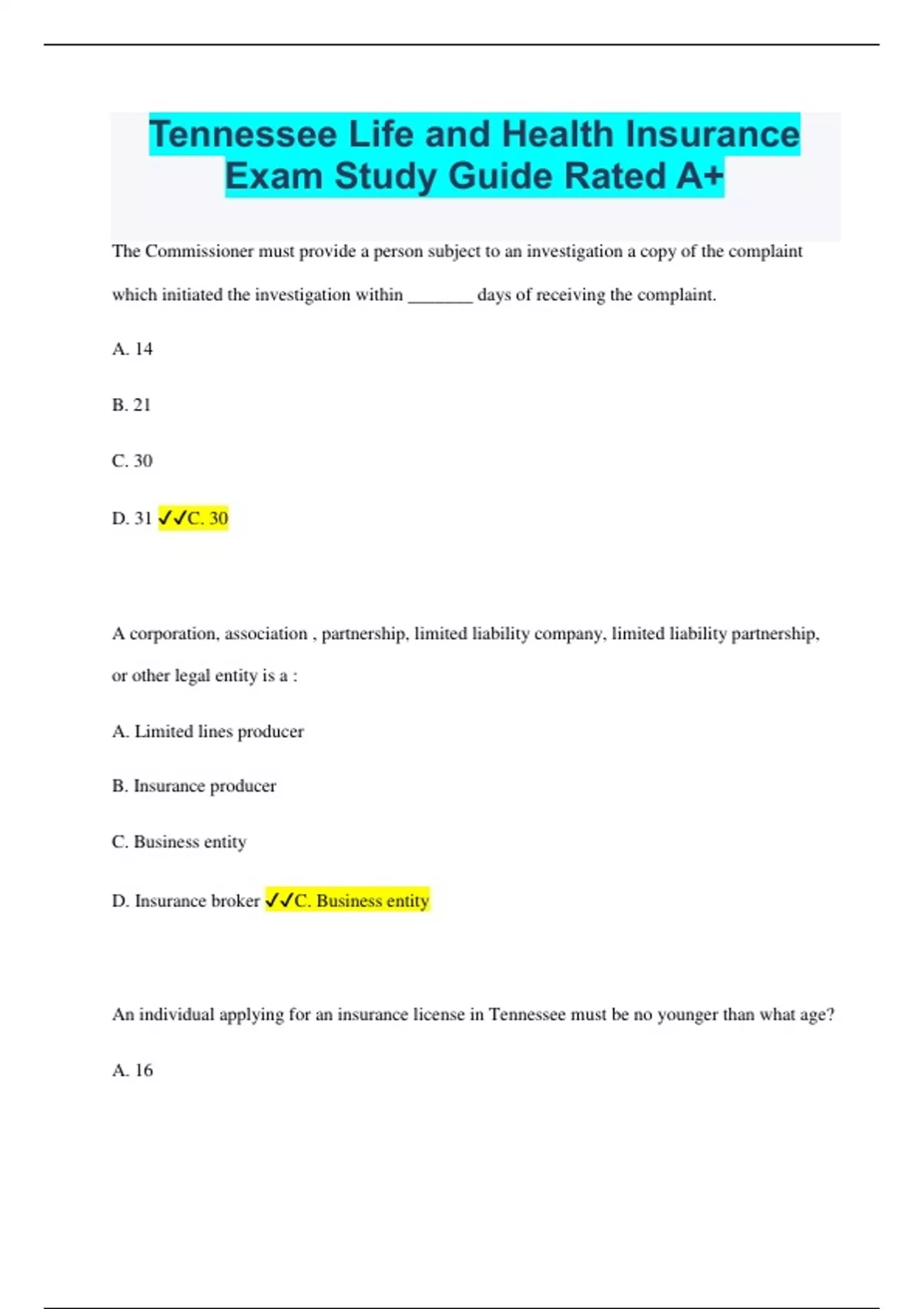 Tennessee Life and Health Insurance Exam Study Guide Rated A+ The Commissioner must provide a person subject to an investigation a copy of the complaint which initiated the investigation within _______ days of receiving the complaint. A. 14 B. 21 C. 30 D. 31 C. 30 A corporation, association , partnership, limited liability company, limited liability partnership, or other legal entity is a : A. Limited lines producer B. Insurance producer C. Business entity D. Insurance broker C. Business entity An individual applying for an insurance license in Tennessee must be no younger than what age? A. 16 B. 18 C. 21 D. 25 B. 18 The commissioner must notify an insurer within _____ days of determining that a producer is ineligible for appointment. A. 5 B. 7 C. 10 D. 15 A. 5 Any change of address must be reported to the Commissioner within _____ days. A. 10 B. 21 C. 30 D. 31 C. 30 Candidates for an insurance producer's license in Tennessee must complete how many hours or prelicensing education per line of authority? A. 10 B. 20 C. 40 D. 80 B. 20 A temporary license issued to a representative of a licensed producer who dies or becomes disabled is valid for up to how many days? A. 120 B. 180 C. 240 D. 360 B. 180 A license is valid for _____ months unless revoked or suspended. A. 12 B. 18 C. 24
