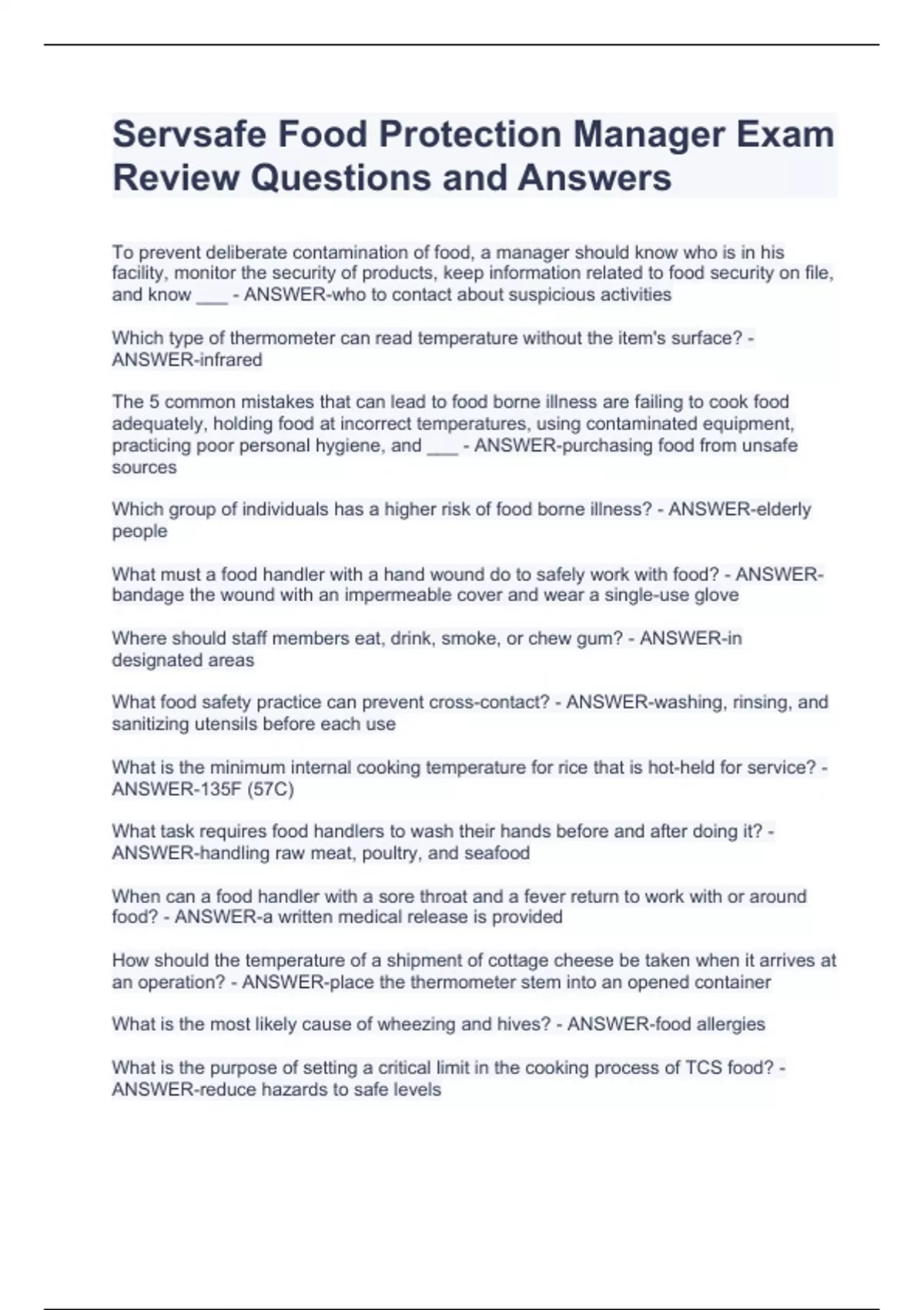 Servsafe Food Protection Manager Exam Review Questions and Answers Servsafe Food Protection Manager Exam Review Questions and Answers Servsafe Food Protection Manager Exam Review Questions and Answers Servsafe Food Protection Manager Exam Review Questions and Answers To prevent deliberate contamination of food, a manager should know who is in his facility, monitor the security of products, keep information related to food security on file, and know ___ - ANSWER-who to contact about suspicious activities Which type of thermometer can read temperature without the item's surface? - ANSWER-infrared The 5 common mistakes that can lead to food borne illness are failing to cook food adequately, holding food at incorrect temperatures, using contaminated equipment, practicing poor personal hygiene, and ___ - ANSWER-purchasing food from unsafe sources Which group of individuals has a higher risk of food borne illness? - ANSWER-elderly people What must a food handler with a hand wound do to safely work with food? - ANSWER-bandage the wound with an impermeable cover and wear a single-use glove Where should staff members eat, drink, smoke, or chew gum? - ANSWER-in designated areas What food safety practice can prevent cross-contact? - ANSWER-washing, rinsing, and sanitizing utensils before each use What is the minimum internal cooking temperature for rice that is hot-held for service? - ANSWER-135F (57C)