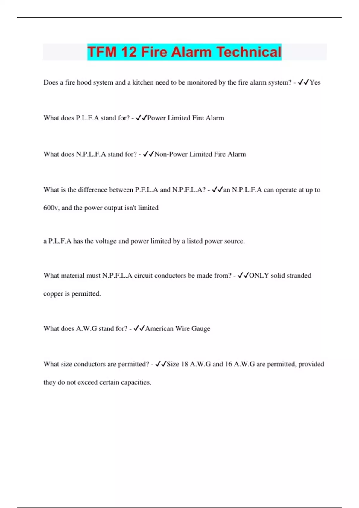 Does a fire hood system and a kitchen need to be monitored by the fire alarm system? - Yes What does P.L.F.A stand for? - Power Limited Fire Alarm What does N.P.L.F.A stand for? - Non-Power Limited Fire Alarm What is the difference between P.F.L.A and N.P.F.L.A? - an N.P.L.F.A can operate at up to 600v, and the power output isn't limited a P.L.F.A has the voltage and power limited by a listed power source. What material must N.P.F.L.A circuit conductors be made from? - ONLY solid stranded copper is permitted. What does A.W.G stand for? - American Wire Gauge What size conductors are permitted? - Size 18 A.W.G and 16 A.W.G are permitted, provided they do not exceed certain capacities.