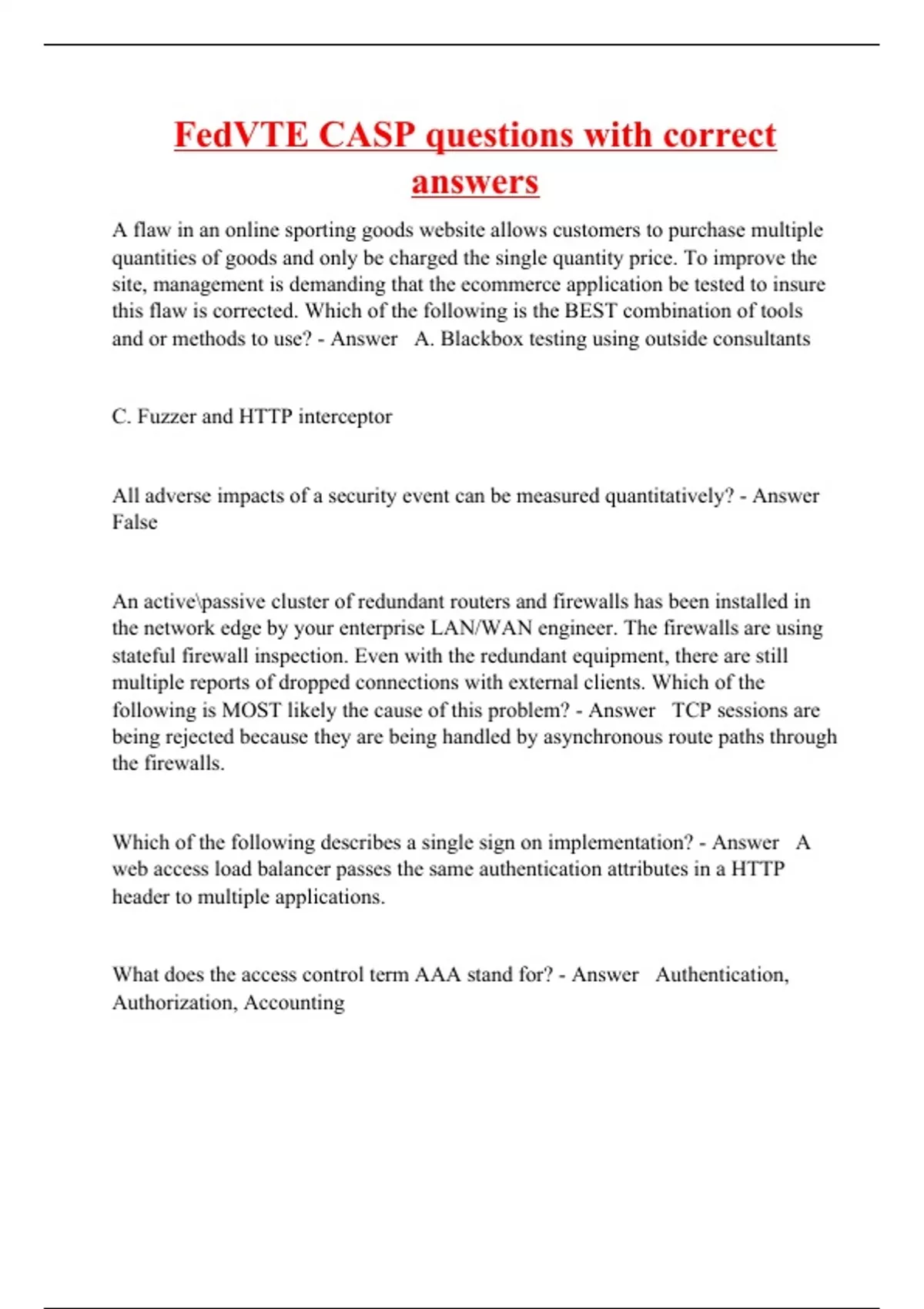 A flaw in an online sporting goods website allows customers to purchase multiple quantities of goods and only be charged the single quantity price. To improve the site, management is demanding that the ecommerce application be tested to insure this flaw is corrected. Which of the following is the BEST combination of tools and or methods to use? - Answer A. Blackbox testing using outside consultants C. Fuzzer and HTTP interceptor All adverse impacts of a security event can be measured quantitatively? - Answer False An activepassive cluster of redundant routers and firewalls has been installed in the network edge by your enterprise LAN/WAN engineer. The firewalls are using stateful firewall inspection. Even with the redundant equipment, there are still multiple reports of dropped connections with external clients. Which of the following is MOST likely the cause of this problem? - Answer TCP sessions are being rejected because they are being handled by asynchronous route paths through the firewalls. Which of the following describes a single sign on implementation? - Answer A web access load balancer passes the same authentication attributes in a HTTP header to multiple applications. What does the access control term AAA stand for? - Answer Authentication, Authorization, Accounting