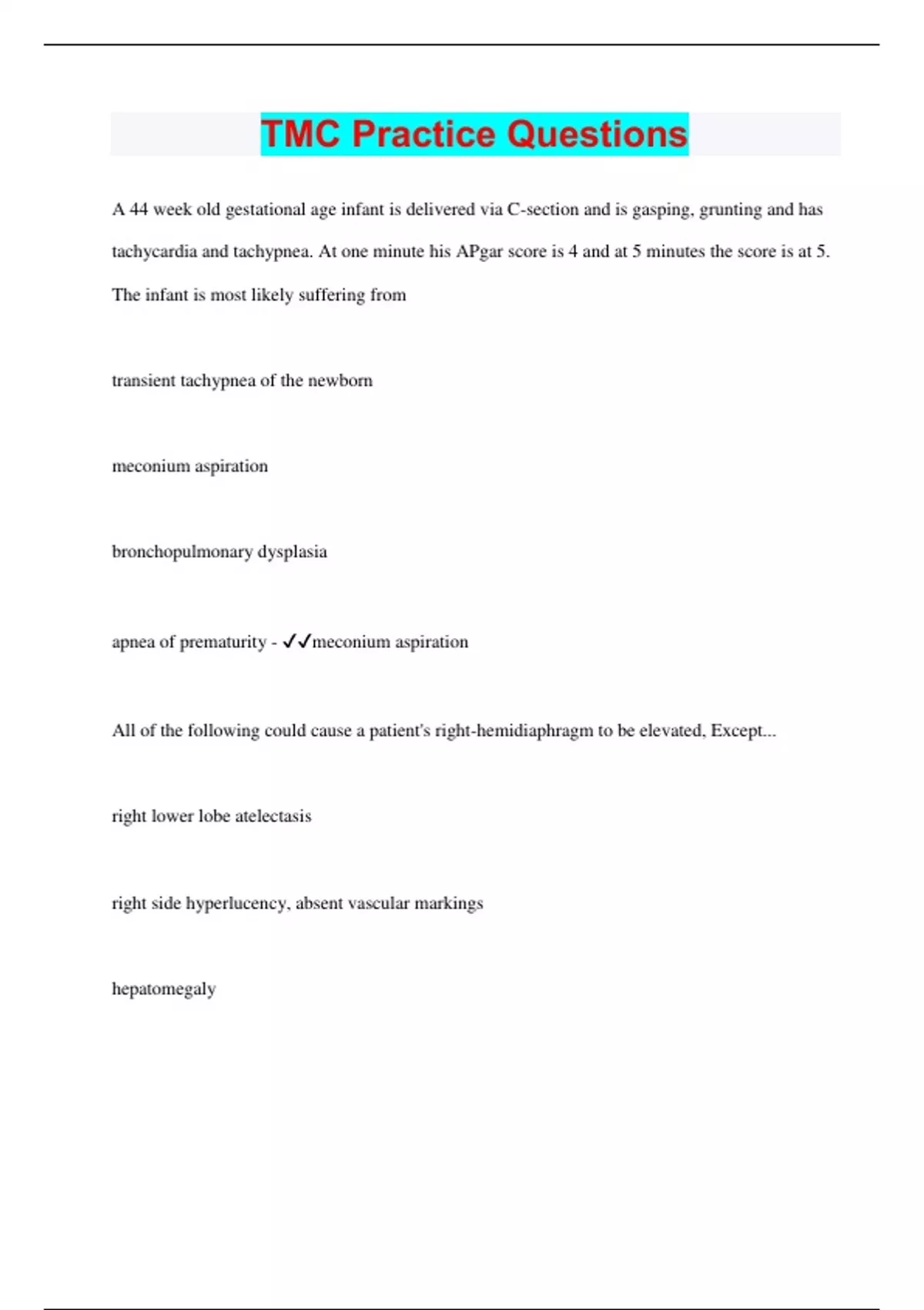 A 44 week old gestational age infant is delivered via C-section and is gasping, grunting and has tachycardia and tachypnea. At one minute his APgar score is 4 and at 5 minutes the score is at 5. The infant is most likely suffering from transient tachypnea of the newborn meconium aspiration bronchopulmonary dysplasia apnea of prematurity - meconium aspiration All of the following could cause a patient's right-hemidiaphragm to be elevated, Except... right lower lobe atelectasis right side hyperlucency, absent vascular markings hepatomegalyright lower lobe consolidation with air bronchograms - right side hyperlucency, absent vascular markings