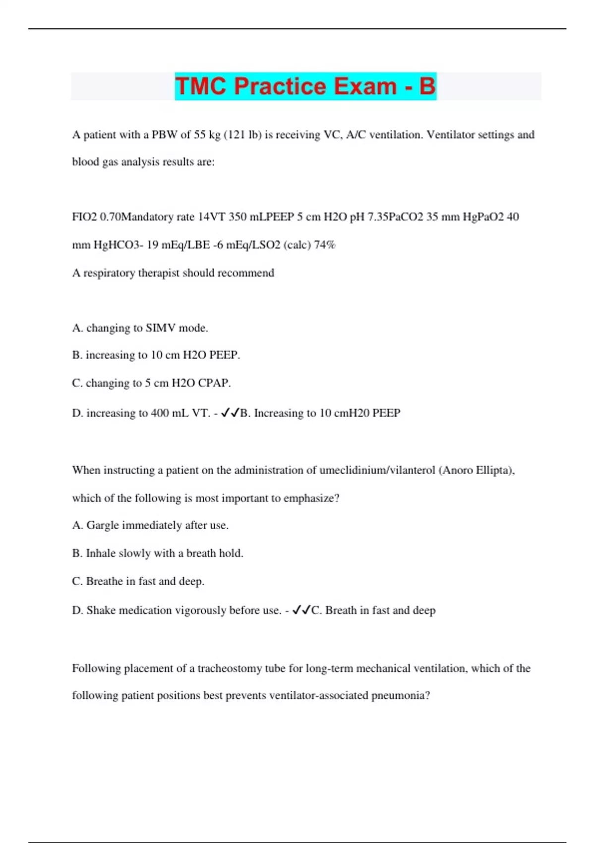 A patient with a PBW of 55 kg (121 lb) is receiving VC, A/C ventilation. Ventilator settings and blood gas analysis results are: FIO2 0.70Mandatory rate 14VT 350 mLPEEP 5 cm H2O pH 7.35PaCO2 35 mm HgPaO2 40 mm HgHCO3- 19 mEq/LBE -6 mEq/LSO2 (calc) 74% A respiratory therapist should recommend A. changing to SIMV mode. B. increasing to 10 cm H2O PEEP. C. changing to 5 cm H2O CPAP. D. increasing to 400 mL VT. - B. Increasing to 10 cmH20 PEEP When instructing a patient on the administration of umeclidinium/vilanterol (Anoro Ellipta), which of the following is most important to emphasize? A. Gargle immediately after use. B. Inhale slowly with a breath hold. C. Breathe in fast and deep. D. Shake medication vigorously before use. - C. Breath in fast and deep