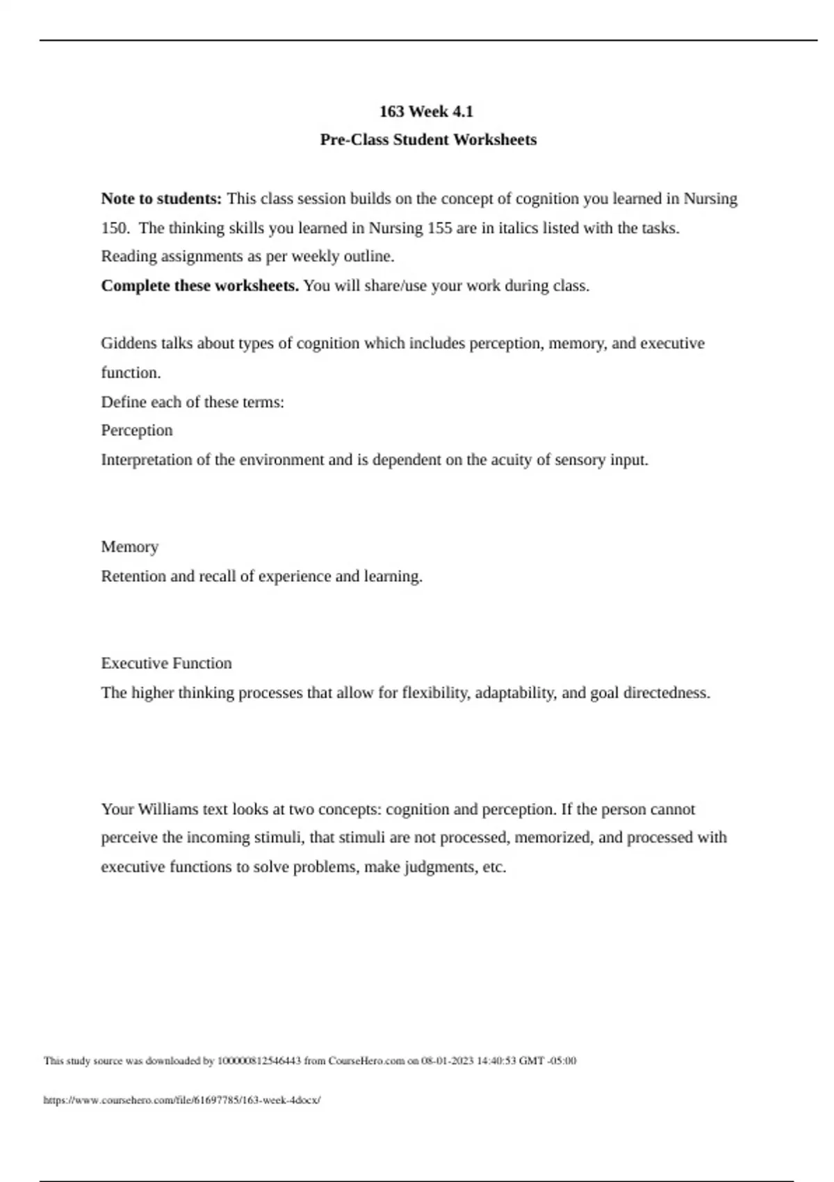 The higher thinking processes that allow for flexibility, adaptability, and goal directedness. Your Williams text looks at two concepts: cognition and perception. If the person cannot perceive the incoming stimuli, that stimuli are not processed, memorized, and processed with executive functions to solve problems, make judgments, etc.This study source was downloaded by 100000812546443 from CourseHero.com on 08-01-2023 14:40:53 GMT -05:00