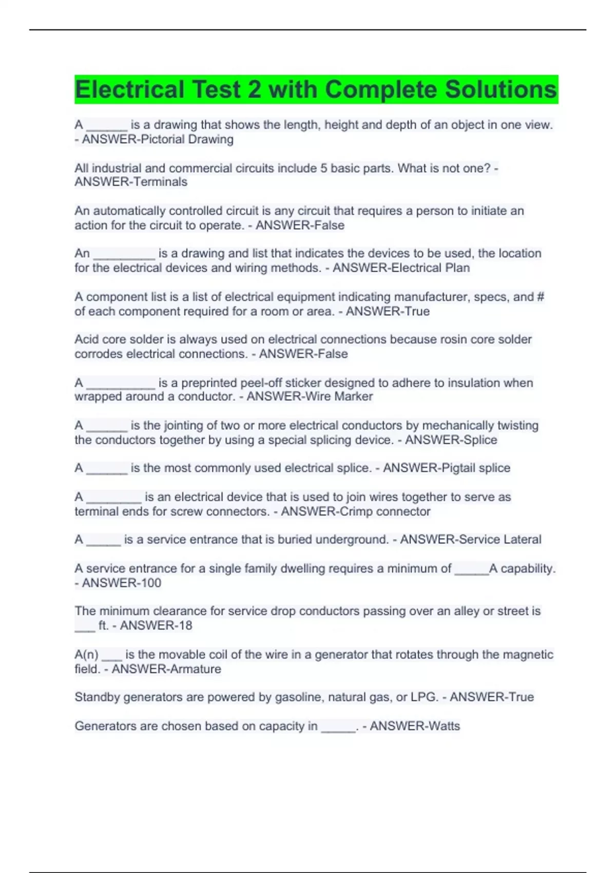 A ______ is a drawing that shows the length, height and depth of an object in one view. - ANSWER-Pictorial Drawing All industrial and commercial circuits include 5 basic parts. What is not one? - ANSWER-Terminals An automatically controlled circuit is any circuit that requires a person to initiate an action for the circuit to operate. - ANSWER-False An _________ is a drawing and list that indicates the devices to be used, the location for the electrical devices and wiring methods. - ANSWER-Electrical Plan A component list is a list of electrical equipment indicating manufacturer, specs, and # of each component required for a room or area. - ANSWER-True Acid core solder is always used on electrical connections because rosin core solder corrodes electrical connections. - ANSWER-False A __________ is a preprinted peel-off sticker designed to adhere to insulation when wrapped around a conductor. - ANSWER-Wire Marker A ______ is the jointing of two or more electrical conductors by mechanically twisting the conductors together by using a special splicing device. - ANSWER-Splice A ______ is the most commonly used electrical splice. - ANSWER-Pigtail splice A ________ is an electrical device that is used to join wires together to serve as terminal ends for screw connectors. - ANSWER-Crimp connector A _____ is a service entrance that is buried underground. - ANSWER-Service Lateral A service entrance for a single family dwelling requires a minimum of _____A capability. - ANSWER-100 The minimum clearance for service drop conductors passing over an alley or street is ___ ft. - ANSWER-18 A(n) ___ is the movable coil of the wire in a generator that rotates through the magnetic field. - ANSWER-Armature Standby generators are powered by gasoline, natural gas, or LPG. - ANSWER-True Generators are chosen based on capacity in _____. - ANSWER-Watts