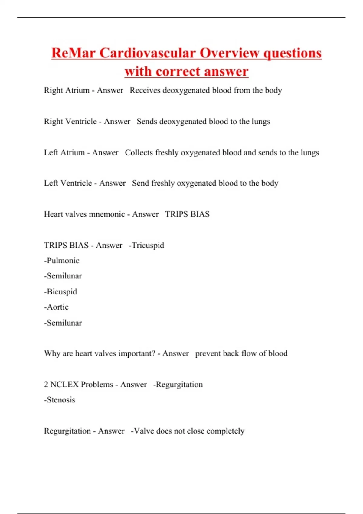 ReMar Cardiovascular Overview questions with correct answer