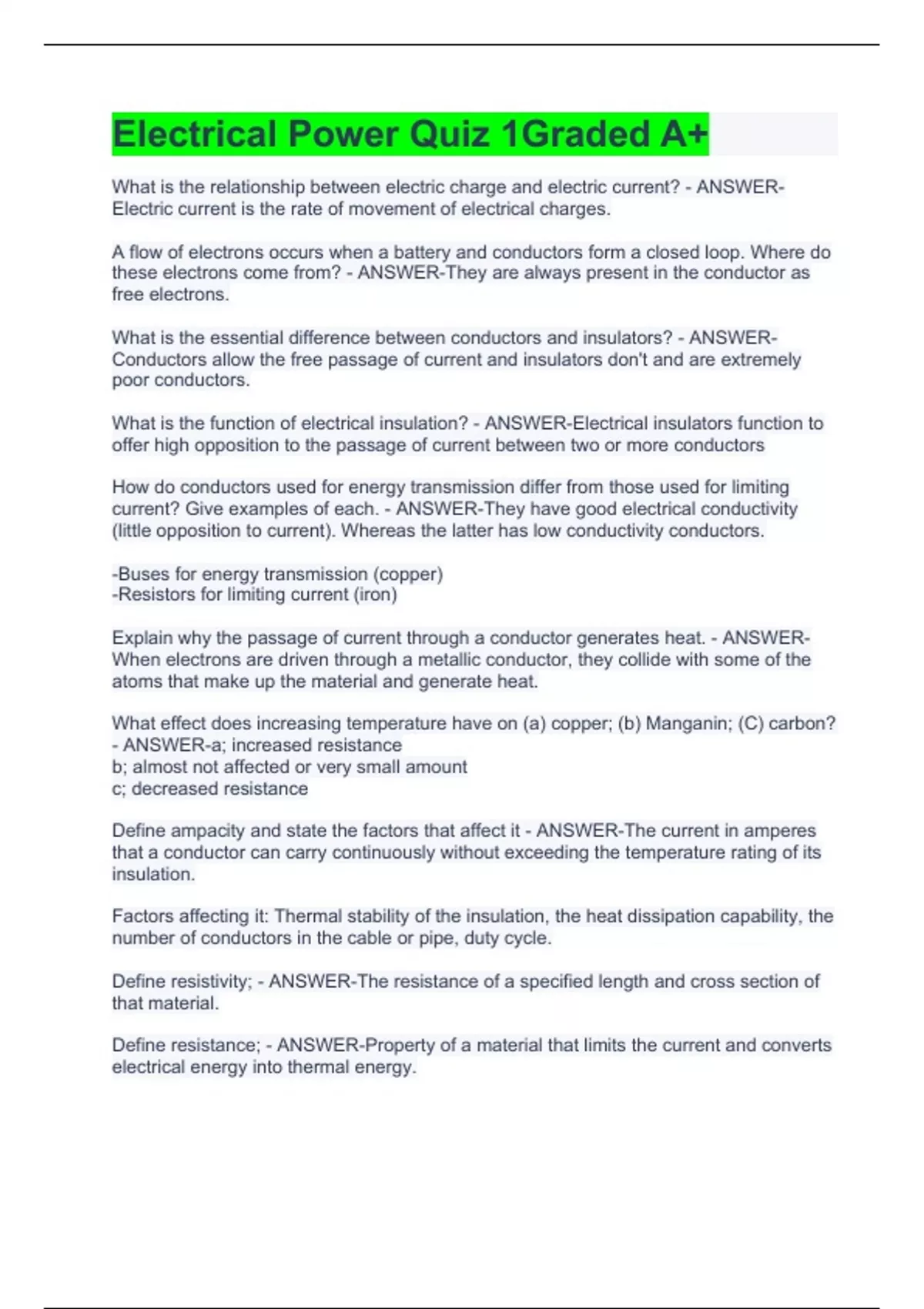 What is the relationship between electric charge and electric current? - ANSWER-Electric current is the rate of movement of electrical charges. A flow of electrons occurs when a battery and conductors form a closed loop. Where do these electrons come from? - ANSWER-They are always present in the conductor as free electrons. What is the essential difference between conductors and insulators? - ANSWER-Conductors allow the free passage of current and insulators don't and are extremely poor conductors. What is the function of electrical insulation? - ANSWER-Electrical insulators function to offer high opposition to the passage of current between two or more conductors How do conductors used for energy transmission differ from those used for limiting current? Give examples of each. - ANSWER-They have good electrical conductivity (little opposition to current). Whereas the latter has low conductivity conductors. -Buses for energy transmission (copper) -Resistors for limiting current (iron) Explain why the passage of current through a conductor generates heat. - ANSWER-When electrons are driven through a metallic conductor, they collide with some of the atoms that make up the material and generate heat. What effect does increasing temperature have on (a) copper; (b) Manganin; (C) carbon? - ANSWER-a; increased resistance b; almost not affected or very small amount c; decreased resistance Define ampacity and state the factors that affect it - ANSWER-The current in amperes that a conductor can carry continuously without exceeding the temperature rating of its insulation. Factors affecting it: Thermal stability of the insulation, the heat dissipation capability, the number of conductors in the cable or pipe, duty cycle. Define resistivity; - ANSWER-The resistance of a specified length and cross section of that material. Define resistance; - ANSWER-Property of a material that limits the current and converts electrical energy into thermal energy.