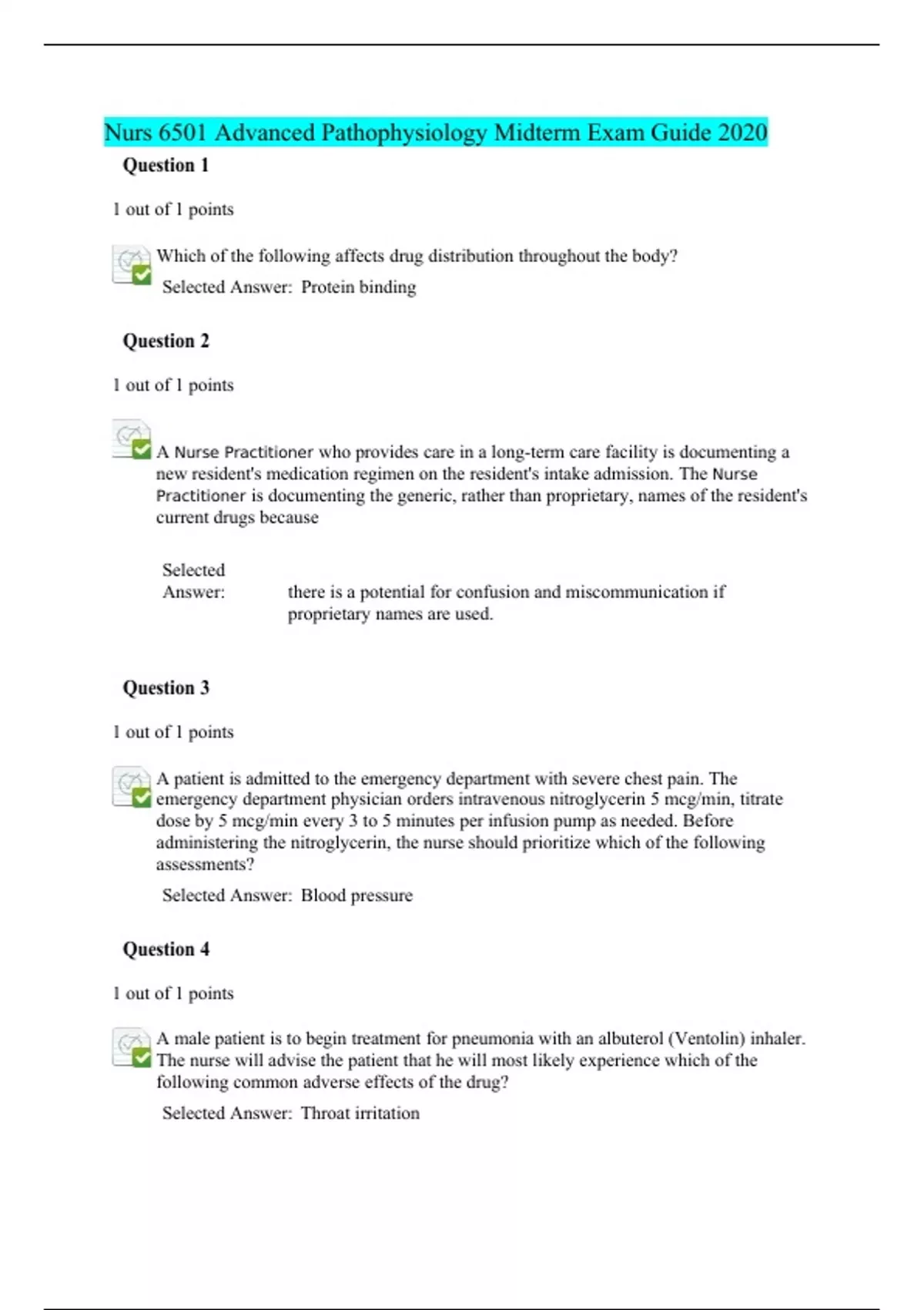 Nurs 6501 Advanced Pathophysiology Midterm Exam Guide 2020