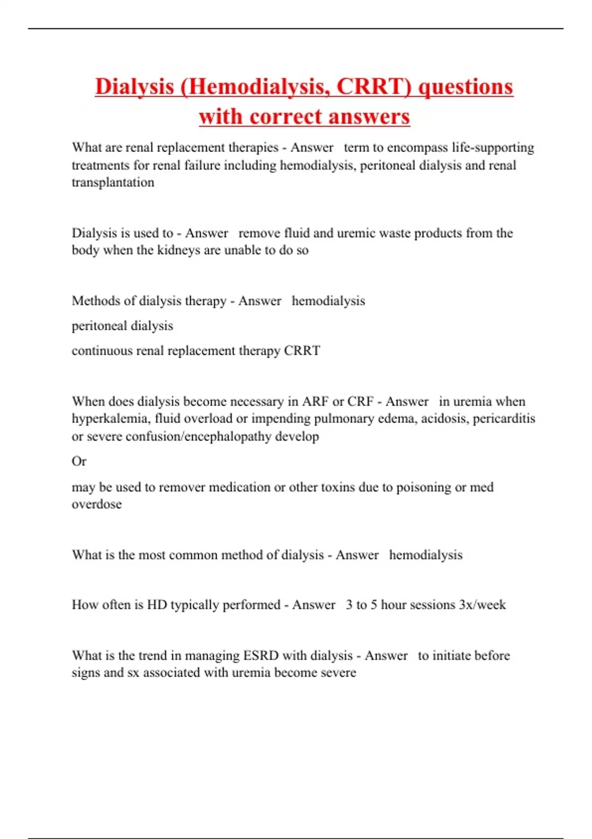 Dialysis (Hemodialysis, CRRT) questions with correct answers