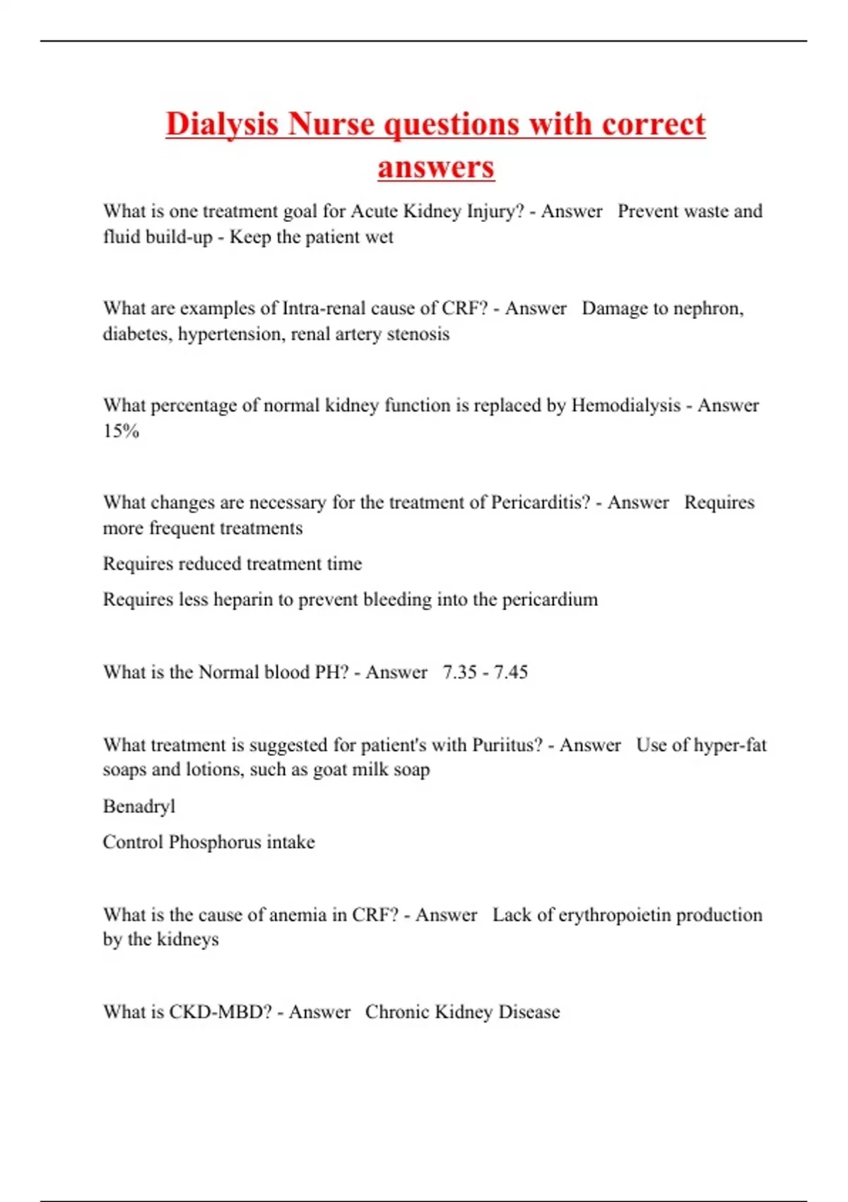 What is one treatment goal for Acute Kidney Injury? - Answer Prevent waste and fluid build-up - Keep the patient wet What are examples of Intra-renal cause of CRF? - Answer Damage to nephron, diabetes, hypertension, renal artery stenosis What percentage of normal kidney function is replaced by Hemodialysis - Answer 15% What changes are necessary for the treatment of Pericarditis? - Answer Requires more frequent treatments Requires reduced treatment time Requires less heparin to prevent bleeding into the pericardium What is the Normal blood PH? - Answer 7.35 - 7.45 What treatment is suggested for patient's