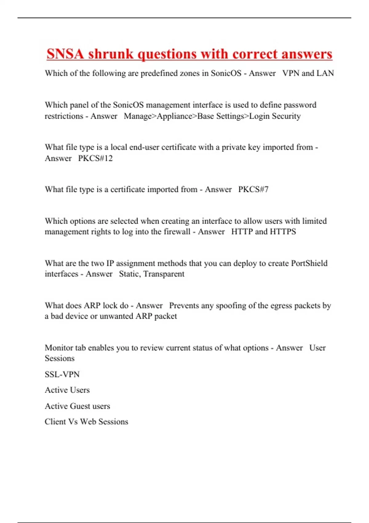 Which of the following are predefined zones in SonicOS - Answer VPN and LAN Which panel of the SonicOS management interface is used to define password restrictions - Answer Manage>Appliance>Base Settings>Login Security What file type is a local end-user certificate with a private key imported from - Answer PKCS#12 What file type is a certificate imported from - Answer PKCS#7 Which options are selected when creating an interface to allow users with limited management rights to log into the firewall - Answer HTTP and HTTPS What are the two IP assignment methods that you can deploy to create PortShield interfaces - Answer Static, Transparent What does ARP lock do - Answer Prevents any spoofing of the egress packets by a bad device or unwanted ARP packet Monitor tab enables you to review current status of what options - Answer User Sessions