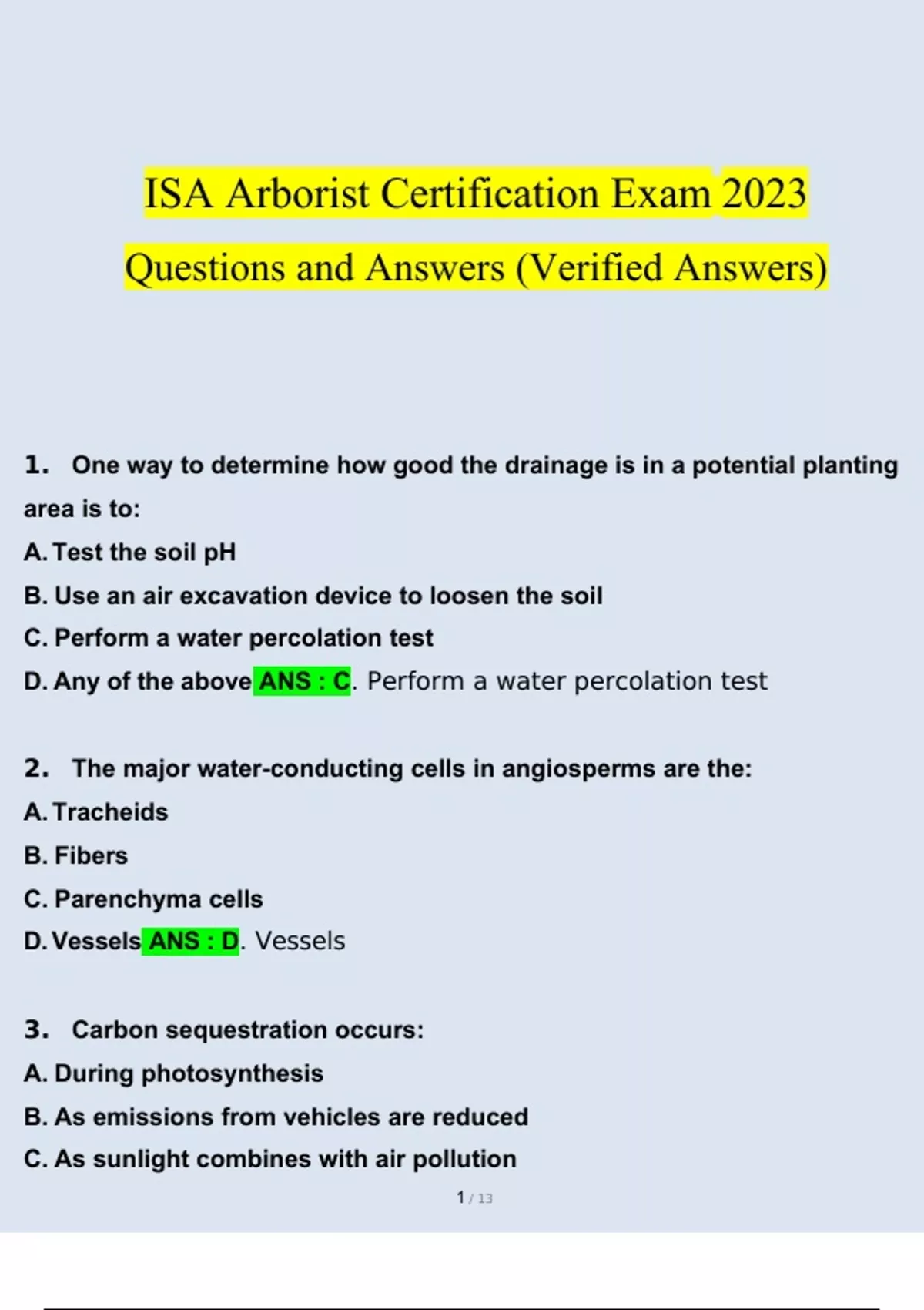 ISA Arborist Certification Exam 2023 Questions and Answers (Verified Answers) ISA Arborist Certification Exam 2023 Questions and Answers (Verified Answers)