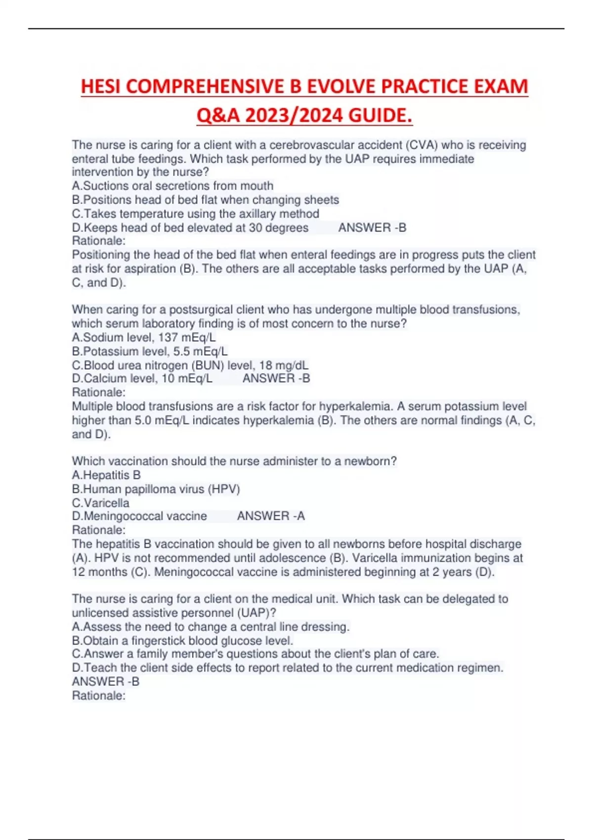 HESI COMPREHENSIVE B EVOLVE PRACTICE EXAM Q&A 2023/2024 GUIDE RATED A.
