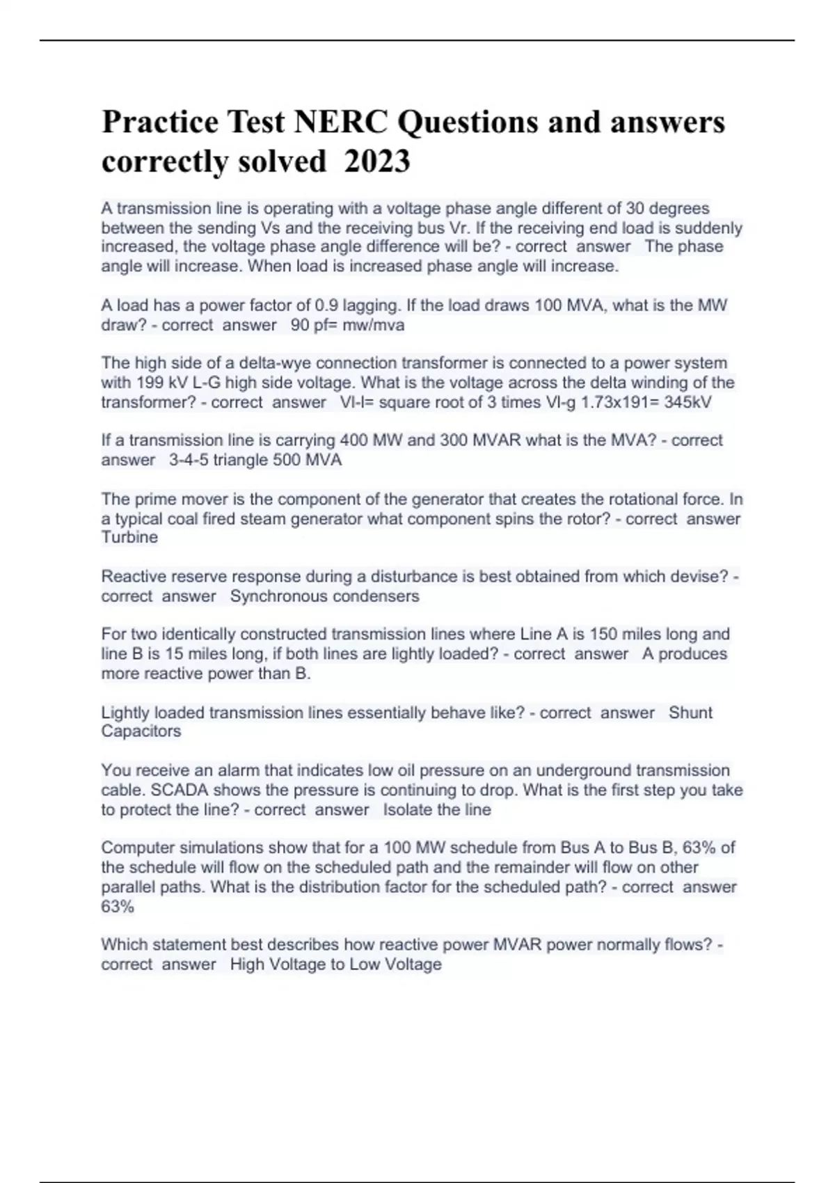 Practice Test NERC Questions and answers correctly solved 2023