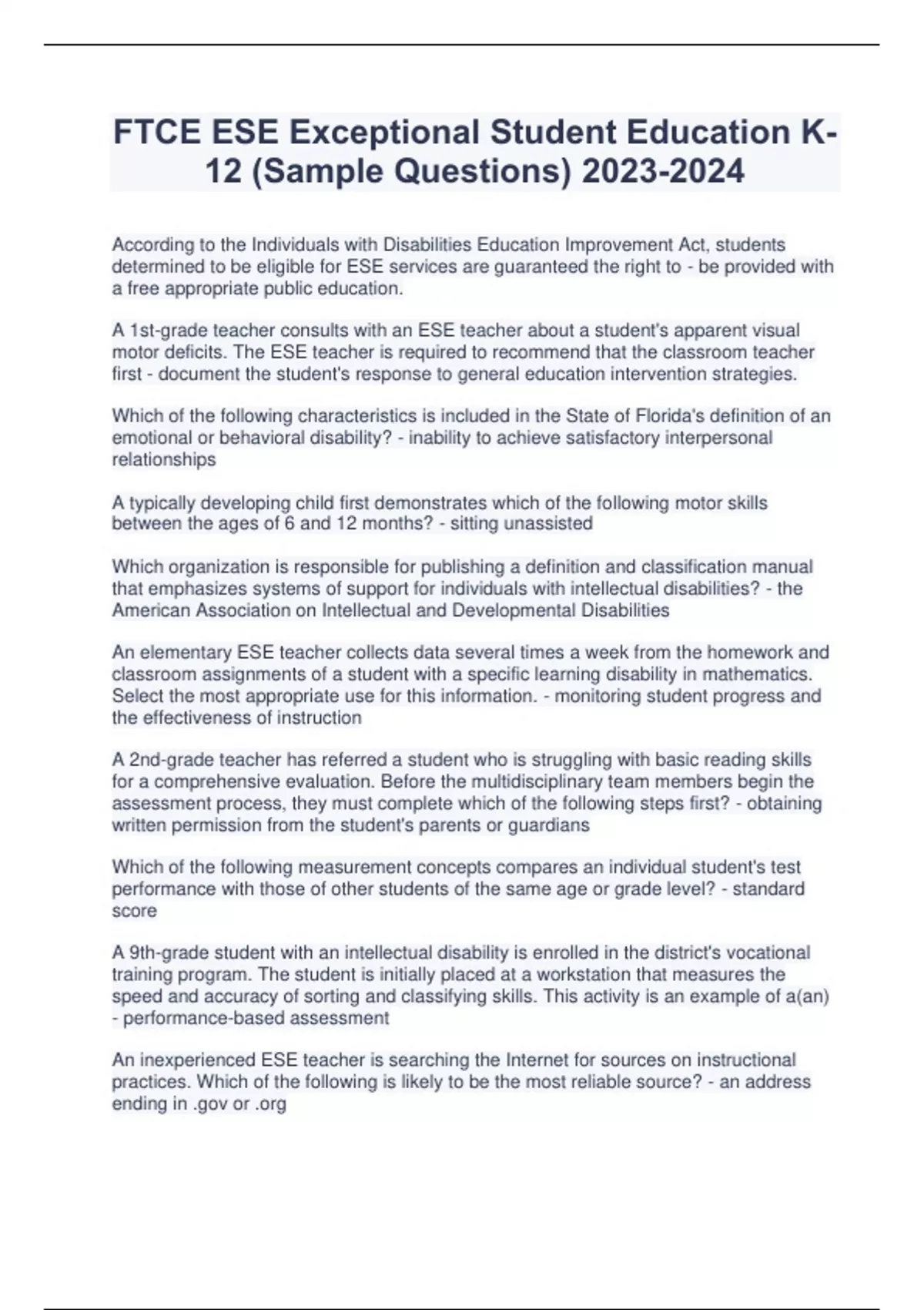 According to the Individuals with Disabilities Education Improvement Act, students determined to be eligible for ESE services are guaranteed the right to - be provided with a free appropriate public education. A 1st-grade teacher consults with an ESE teacher about a student's apparent visual motor deficits. The ESE teacher is required to recommend that the classroom teacher first - document the student's response to general education intervention strategies. Which of the following characteristics is included in the State of Florida's definition of an emotional or behavioral disability? - inability to achieve satisfactory interpersonal relationships A typically developing child first demonstrates which of the following motor skills between the ages of 6 and 12 months? - sitting unassisted Which organization is responsible for publishing a definition and classification manual that emphasizes systems of support for individuals with intellectual disabilities? - the American Association on Intellectual and Developmental Disabilities An elementary ESE teacher collects data several times a week from the homework and classroom assignments of a student with a specific learning disability in mathematics. Select the most appropriate use for this information. - monitoring student progress and the effectiveness of instruction A 2nd-grade teacher has referred a student who is struggling with basic reading skills for a comprehensive evaluation. Before the multidisciplinary team members begin the assessment process, they must complete which of the following steps first? - obtaining written permission from the student's parents or guardians Which of the following measurement concepts compares an individual student's test performance with those of other students of the same age or grade level? - standard score A 9th-grade student with an intellectual disability is enrolled in the district's vocational training program. The student is initially placed at a workstation that measures the speed and accuracy of sorting and classifying skills. This activity is an example of a(an) - performance-based assessment An inexperienced ESE teacher is searching the Internet for sources on instructional practices. Which of the following is likely to be the most reliable source? - an address ending in .gov or .org