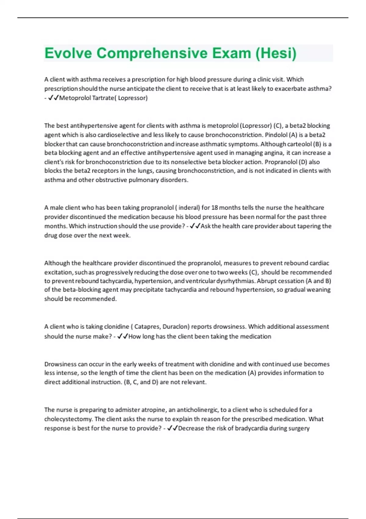 A client with asthma receives a prescription for high blood pressure during a clinic visit. Which prescription should the nurse anticipate the client to receive that is at least likely to exacerbate asthma? - Metoprolol Tartrate( Lopressor) The best antihypertensive agent for clients with asthma is metoprolol (Lopressor) (C), a beta2 blocking agent which is also cardioselective and less likely to cause bronchoconstriction. Pindolol (A) is a beta2 blocker that can cause bronchoconstriction and increase asthmatic symptoms. Although carteolol (B) is a beta blocking agent and an effective antihypertensive agent used in managing angina, it can increase a client's risk for bronchoconstriction due to its nonselective beta blocker action. Propranolol (D) also blocks the beta2 receptors in the lungs, causing bronchoconstriction, and is not indicated in clients with asthma and other obstructive pulmonary disorders. A male client who has been taking propranolol ( inderal) for 18 months tells the nurse the healthcare provider discontinued the medication because his blood pressure has been normal for the past three months. Which instruction should the use provide? - Ask the health care provider about tapering the drug dose over the next week. Although the healthcare provider discontinued the propranolol, measures to prevent rebound cardiac excitation, such as progressively reducing the dose over one to two weeks (C), should be recommended to prevent rebound tachycardia, hypertension, and ventricular dysrhythmias. Abrupt cessation (A and B) of the beta-blocking agent may precipitate tachycardia and rebound hypertension, so gradual weaning should be recommended. A client who is taking clonidine ( Catapres, Duraclon) reports drowsiness. Which additional assessment should the nurse make? - How long has the client been taking the medication Drowsiness can occur in the early weeks of treatment with clonidine and with continued use becomes less intense, so the length of time the client has been on the medication (A) provides information to direct additional instruction. (B, C, and D) are not relevant. The nurse is preparing to admister atropine, an anticholinergic, to a client who is scheduled for a cholecystectomy. The client asks the nurse to explain th reason for the prescribed medication. What response is best for the nurse to provide? - Decrease the risk of bradycardia during surgery