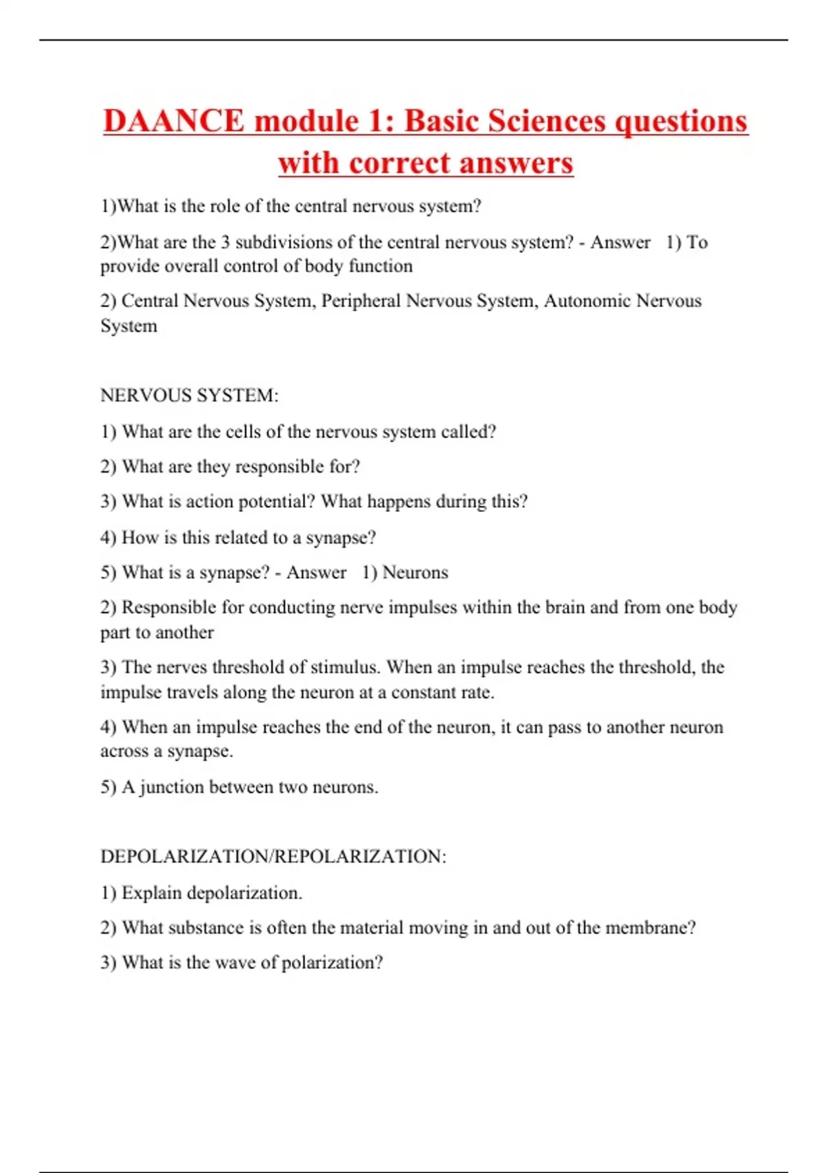 1)What is the role of the central nervous system? 2)What are the 3 subdivisions of the central nervous system? - Answer 1) To provide overall control of body function 2) Central Nervous System, Peripheral Nervous System, Autonomic Nervous System NERVOUS SYSTEM: 1) What are the cells of the nervous system called? 2) What are they responsible for? 3) What is action potential? What happens during this? 4) How is this related to a synapse? 5) What is a synapse? - Answer 1) Neurons 2) Responsible for conducting nerve impulses within the brain and from one body part to another 3) The nerves threshold of stimulus. When an impulse reaches the threshold, the impulse travels along the neuron at a constant rate. 4) When an impulse reaches the end of the neuron, it can pass to another neuron across a synapse. 5) A junction between two neurons. DEPOLARIZATION/REPOLARIZATION: 1) Explain depolarization.