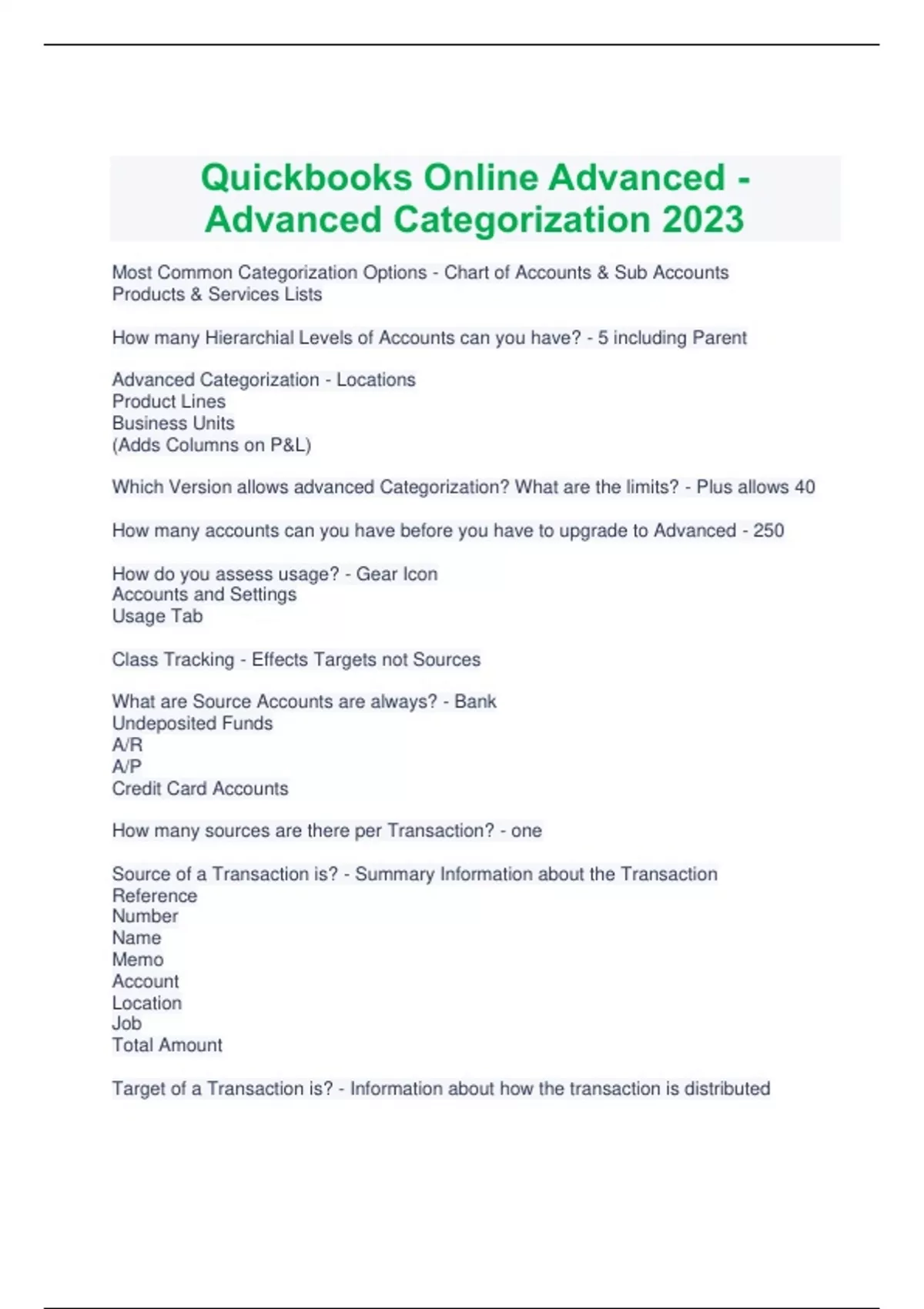 Most Common Categorization Options - Chart of Accounts & Sub Accounts Products & Services Lists How many Hierarchial Levels of Accounts can you have? - 5 including Parent Advanced Categorization - Locations Product Lines Business Units (Adds Columns on P&L) Which Version allows advanced Categorization? What are the limits? - Plus allows 40 How many accounts can you have before you have to upgrade to Advanced - 250 How do you assess usage? - Gear Icon Accounts and Settings Usage Tab Class Tracking - Effects Targets not Sources What are Source Accounts are always? - Bank Undeposited Funds A/R A/P Credit Card Accounts How many sources are there per Transaction? - one Source of a Transaction is? - Summary Information about the Transaction Reference Number Name Memo Account Location Job Total Amount Target of a Transaction is? - Information about how the transaction is distributed