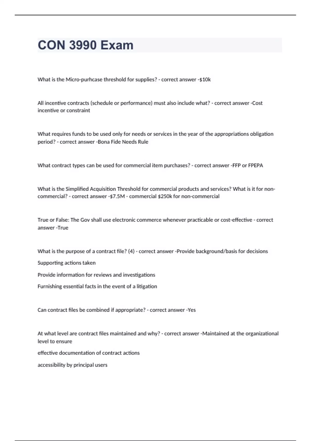 What is the Micro-purhcase threshold for supplies? - correct answer -$10k All incentive contracts (schedule or performance) must also include what? - correct answer -Cost incentive or constraint What requires funds to be used only for needs or services in the year of the appropriations obligation period? - correct answer -Bona Fide Needs Rule What contract types can be used for commercial item purchases? - correct answer -FFP or FPEPA What is the Simplified Acquisition Threshold for commercial products and services? What is it for non-commercial? - correct answer -$7.5M - commercial $250k for non-commercial True or False: The Gov shall use electronic commerce whenever practicable or cost-effective - correct answer -True What is the purpose of a contract file? (4) - correct answer -Provide background/basis for decisions Supporting actions taken Provide information for reviews and investigations Furnishing essential facts in the event of a litigation Can contract files be combined if appropriate? - correct answer -Yes At what level are contract files maintained and why? - correct answer -Maintained at the organizational level to ensure effective documentation of contract actions accessibility by principal users minimal establishment of duplicate and working files safeguarding classified docs conformance with agency regs