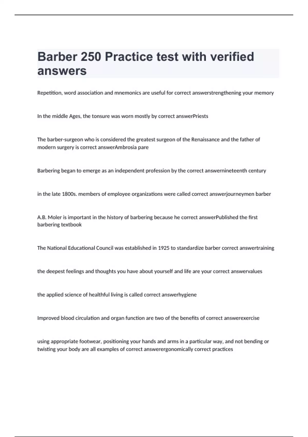 Barber 250 Practice test with verified answers