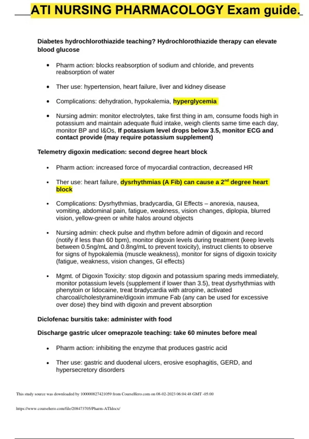 Diabetes hydrochlorothiazide teaching? Hydrochlorothiazide therapy can elevate blood glucose Pharm action: blocks reabsorption of sodium and chloride, and prevents reabsorption of water Ther use: hypertension, heart failure, liver and kidney disease Complications: dehydration, hypokalemia, hyperglycemia Nursing admin: monitor electrolytes, take first thing in am, consume foods high in potassium and maintain adequate fluid intake, weigh clients same time each day, monitor BP and I&Os, If potassium level drops below 3.5, monitor ECG and contact provide (may require potassium supplement) Telemetry digoxin medication: second degree heart block Pharm action: increased force of myocardial contraction, decreased HR Ther use: heart failure, dysrhythmias (A Fib) can cause a 2nd degree heart block Complications: Dysrhythmias, bradycardia, GI Effects – anorexia, nausea, vomiting, abdominal pain, fatigue, weakness, vision changes, diplopia, blurred vision, yellow-green or white halos around objects Nursing admin: check pulse and rhythm before admin of digoxin and record (notify if less than 60 bpm), monitor digoxin levels during treatment (keep levels between 0.5ng/mL and 0.8ng/mL to prevent toxicity), instruct clients to observe for signs of hypokalemia (muscle weakness), monitor for signs of digoxin toxicity (fatigue, weakness, vision changes, GI effects) Mgmt. of Digoxin Toxicity: stop digoxin and potassium sparing meds immediately, monitor potassium levels (supplement if lower than 3.5), treat dysrhythmias with phenytoin or lidocaine, treat bradycardia with atropine, activated charcoal/cholestyramine/digoxin immune Fab (any can be used for excessive over dose) they bind with digoxin and prevent absorption Diclofenac bursitis take: administer with food Discharge gastric ulcer omeprazole teaching: take 60 minutes before meal Pharm action: inhibiting the enzyme that produces gastric acid Ther use: gastric and duodenal ulcers, erosive esophagitis, GERD, and hypersecretory disord