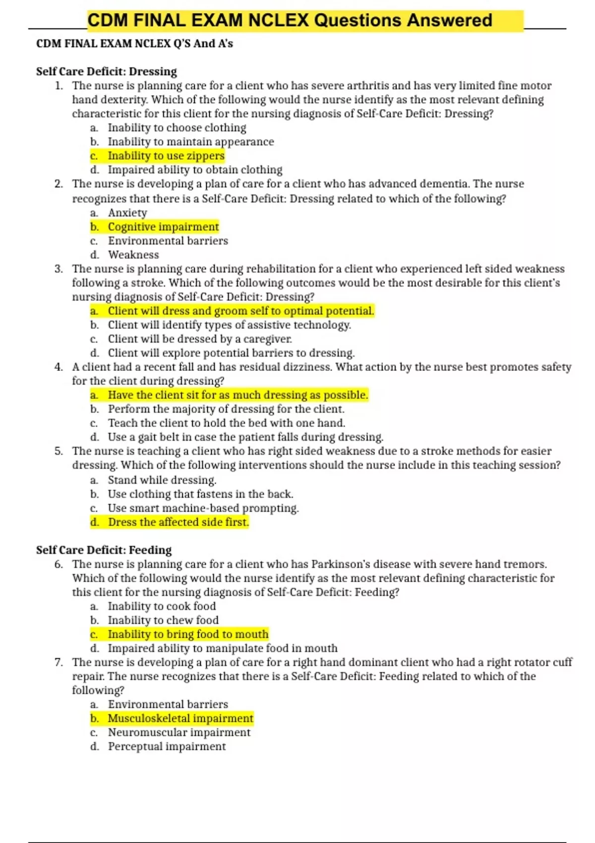 CDM FINAL EXAM NCLEX Questions Answered Summer 2023.