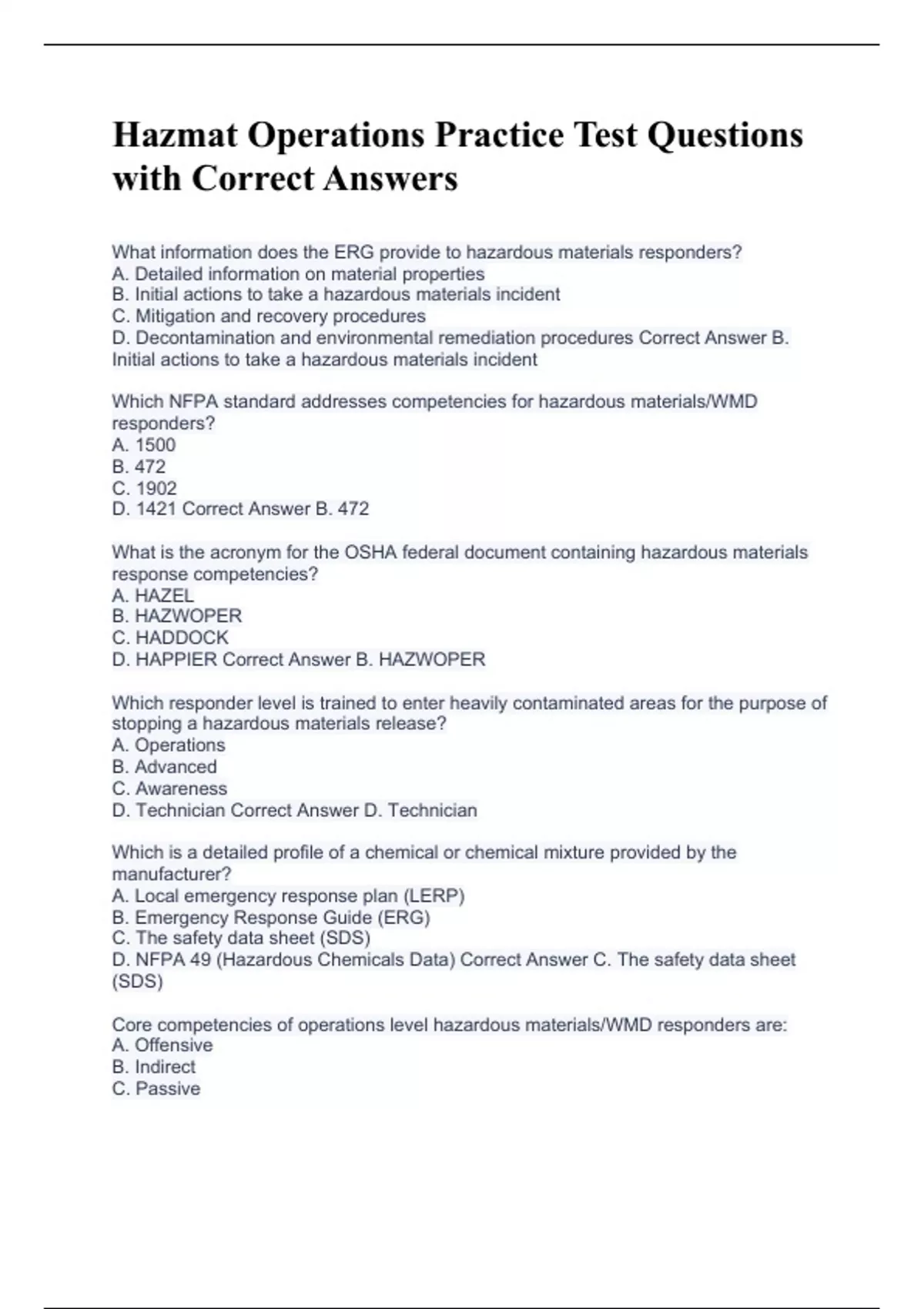 What information does the ERG provide to hazardous materials responders? A. Detailed information on material properties B. Initial actions to take a hazardous materials incident C. Mitigation and recovery procedures D. Decontamination and environmental remediation procedures Correct Answer B. Initial actions to take a hazardous materials incident Which NFPA standard addresses competencies for hazardous materials/WMD responders? A. 1500 B. 472 C. 1902 D. 1421 Correct Answer B. 472 What is the acronym for the OSHA federal document containing hazardous materials response competencies? A. HAZEL B. HAZWOPER C. HADDOCK D. HAPPIER Correct Answer B. HAZWOPER Which responder level is trained to enter heavily contaminated areas for the purpose of stopping a hazardous materials release? A. Operations B. Advanced C. Awareness D. Technician Correct Answer D. Technician Which is a detailed profile of a chemical or chemical mixture provided by the manufacturer? A. Local emergency response plan (LERP) B. Emergency Response Guide (ERG) C. The safety data sheet (SDS) D. NFPA 49 (Hazardous Chemicals Data) Correct Answer C. The safety data sheet (SDS) Core competencies of operations level hazardous materials/WMD responders are: A. Offensive B. Indirect C. Passive
