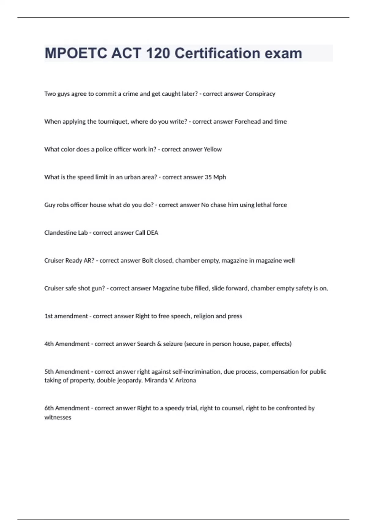 MPOETC ACT 120 CERTIFICATION EXAM REVIEWconspiracy Situation where two people agree to commit a crime and are caught later? forehead When applying a tourniquet to someone, where should you write the time on their body at which it was applied? yellow What color does a police officer work in? (Traffic Light Analogy) 35 mph What is the normal speed limit for an urban area? use lethal force What should you NOT do when someone robs a Police Officer? DEA What federal agency should you notify if you come into contact with a clandestine lab? cruiser ready What is the status of an AR Rifle when the bolt is closed, the chamber is empty, and the magazine is seated in the magazine well? cruiser ready What is the status of a Shot Gun that has a filled magazine tube, a forward slide, and an activated chamber safety switch? 1st amendment What is the constitutional right to free speech, religion, and press? 4th amendment What is the constitutional right to a person's secured house, paper, and effects? 5th amendment What is the constitutional right against self-incrimination, due process, compensation for public taking of property, and double-jeopardy? This right established "Miranda Warnings" in the case of Miranda v. Arizona. 6th amendment What is the constitutional right to speedy trial, to counsel, and to be confronted by witnesses and/or accusers? 8th amendment What is the constitutional right to bail and protection from cruel and unusual punishment? 14th amendment What is the constitutional right to life, liberty, property, and equal rights for all? mapp v. ohio What U.S. Supreme Court case made the disposition of the "Exclusionary Rule?" 4th amendment What amendment provides guidelines and sets standards for the use of force?