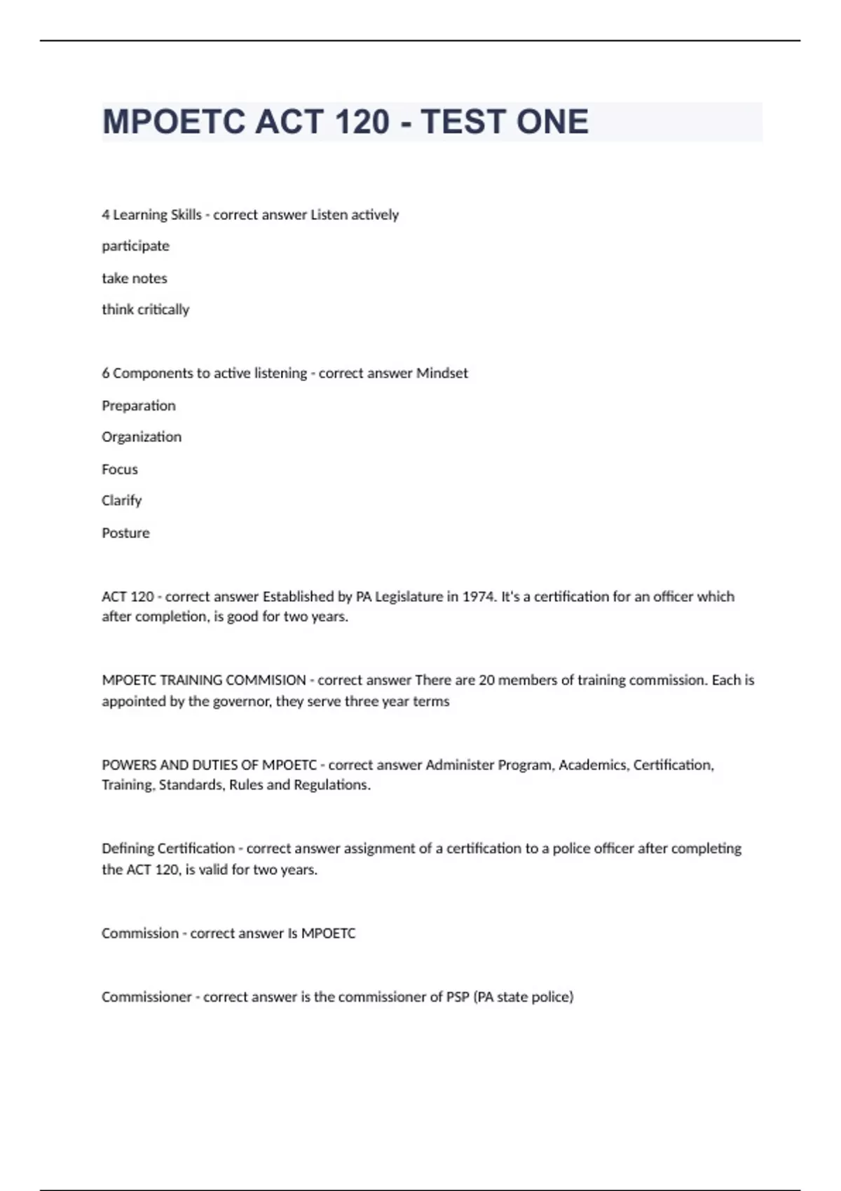 MPOETC ACT 120 - TEST ONE4 Learning Skills Listen actively participate take notes think critically 6 Components to active listening Mindset Preparation Organization Focus Clarify Posture ACT 120 Established by PA Legislature in 1974. It's a certification for an officer which after completion, is good for two years. MPOETC TRAINING COMMISION There are 20 members of training commission. Each is appointed by the governor, they serve three year terms POWERS AND DUTIES OF MPOETC Administer Program, Academics, Certification, Training, Standards, Rules and Regulations. Defining Certification assignment of a certification to a police officer after completing the ACT 120, is valid for two years. Commission Is MPOETC Commissioner is the commissioner of PSP (PA state police) Police Department A public agency having general police powers and charged with making arrests in connection with the enforcement of criminal or traffic laws. It includes the sheriff's office and university police. Police officer An employee assigned to criminal or traffic law enforcement Commission members 20 members,etc (SEE PAGE 13 for remaining) PSP Commissioner is chairman, Attorney General police commisioner of a city of the first class. Commission power and duties a. Administer program b. Academies c. Certification d. Training e. Standards f. Rules and regulations PA CRIMES CODE TITLE 18 PA VEHICLE CODE TITLE 75 Systems that assist in maintenance of order. Value System Moral System Belief System Power Derived from the constitutional authority of government. Sir Robert Peel "Father of modern day policing" Nine principles that are basic guidelines for the London Metropolitan Police in 1829 and the foundations of modern law enforcement doctrine. American Law Enforcement followed the English Model. -watch system night watch in which each watchman signaled to others or citizens for help