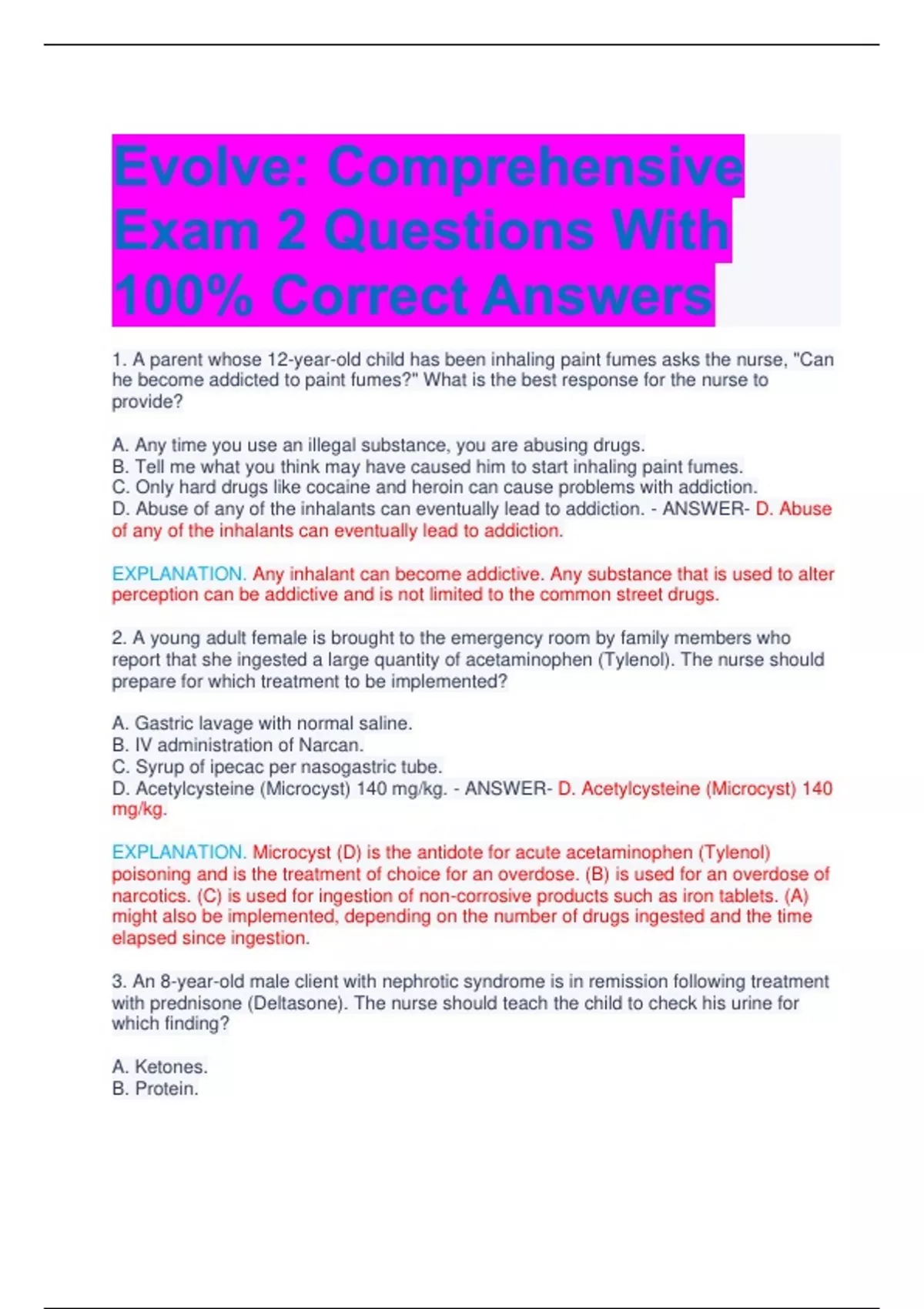 Evolve: Comprehensive Exam 2 Questions With 100% Correct Answers 1. A parent whose 12-year-old child has been inhaling paint fumes asks the nurse, "Can he become addicted to paint fumes?" What is the best response for the nurse to provide? A. Any time you use an illegal substance, you are abusing drugs. B. Tell me what you think may have caused him to start inhaling paint fumes. C. Only hard drugs like cocaine and heroin can cause problems with addiction. D. Abuse of any of the inhalants can eventually lead to addiction. - ANSWER- D. Abuse of any of the inhalants can eventually lead to addiction. EXPLANATION. Any inhalant can become addictive. Any substance that is used to alter perception can be addictive and is not limited to the common street drugs. 2. A young adult female is brought to the emergency room by family members who report that she ingested a large quantity of acetaminophen (Tylenol). The nurse should prepare for which treatment to be implemented? A. Gastric lavage with normal saline. B. IV administration of Narcan. C. Syrup of ipecac per nasogastric tube. D. Acetylcysteine (Microcyst) 140 mg/kg. - ANSWER- D. Acetylcysteine (Microcyst) 140 mg/kg. EXPLANATION. Microcyst (D) is the antidote for acute acetaminophen (Tylenol) poisoning and is the treatment of choice for an overdose. (B) is used for an overdose of narcotics. (C) is used for ingestion of non-corrosive products such as iron tablets. (A) might also be implemented, depending on the number of drugs ingested and the time elapsed since ingestion. 3. An 8-year-old male client with nephrotic syndrome is in remission following treatment with prednisone (Deltasone). The nurse should teach the child to check his urine for which finding? A. Ketones. B. Protein. C. White blood cells. D. Glucose. - ANSWER- B. Protein. EXPLANATION. Children should be taught to check for protein (albumin) (B) in the urine daily, because a positive reading for protein in the urine is often the only indicator of a relapse of nephrotic syndrome. (C) is an indication of infection. (A and D) should be assessed while the child is receiving corticosteroid therapy, since corticosteroids increase blood glucose. 4. When making a home visit to a family with a teething 4-month-old, what information is most important for the nurse to provide the parents? A. No action is required for the common symptoms associated with teething, which include drooling, irritability, and poor sleeping. B. A slight fever is often associated with teething, but a fever lasting more than three days requires medical attention. C. Though child development is characterized by individual differences, first teeth usually erupt during the seventh month. D. Providing cooled teething toys can help decrease the discomfort associated with tooth eruption. - ANSWER- B. A slight fever is often associated with teething, but a fever lasting more than three days requires medical attention. EXPLANATION. A slight fever that persists longer than three days is likely to be associated with a pathological process, not teething, and the parents should seek the attention of their healthcare provider if it occurs (B). (A, C, and D) provide useful information about teething, but do not have the priority of (B). 5. To treat cystitis, a 14-day course of treatment with cephalexin (Cecola) is prescribed for a client residing in a long-term care facility. Which action is most important for the nurse to take prior to administering the first dose of this medication? A. Take the client's vital signs prior to the first dose and once daily for 14 days. B. Determine if the client has ever had a hypersensitivity reaction to penicillin. C. Review the client's fasting blood glucose levels for a hyperglycemic trend. D. Restrict the use of dairy products in the client's diet for the next 3 weeks. - ANSWER- B. Determine if the client has ever had a hypersensitivity reaction to penicillin. EXPLANATION. Most individuals who have an allergy to penicillin (B) are at risk of hypersensitivity to cephalosporins. To prevent a potential hypersensitivity reaction that could cause a life-threatening episode of anaphylactic shock, the nurse must determine if the client has a known penicillin allergy before giving the client a cephalexin (Cecola) dose. (A, C, and D) are not required interventions for the administration of cephalexin (Cecola). 6. A staff member tells the charge nurse that a float nurse assigned to work on the unit has made several medication errors in the past, but is currently working with the education department to improve this skill. What action is best for the charge nurse to take? A. Arrange for someone to be available to assess and assist the float nurse. B. Assign the float nurse to function as a UAP for the day. C. Dismiss the staff nurse's report about the float nurse because it may be just gossip. D. Call the nursing supervisor and request a different employee be sent to the unit. - ANSWER- A. Arrange for someone to be available to assess and assist the float nurse. EXPLANATION. The float nurse is receiving education, but careful assessment of her or his skills and assistance, as needed, is still warranted, so (A) is the best choice. Though the staff member's report may indeed be gossip, failure to pay attention to the information could constitute negligence on the part of the charge nurse (C). (D) is not the best way to manage the unit. (B) is not the best use of a licensed person and would also eliminate the float nurse's opportunity to improve medication administration skills. 7. The blood pressure readings obtained by unlicensed assistive personnel (UAP) are consistently different from those obtained by other staff members. What action should the charge nurse take first? A. Ask the education department to provide additional training for the UAP. B. Observe the UAP performing blood pressure measurements. C. Make staff members aware of the possible errors in blood pressure readings. D. Counsel the UAP about