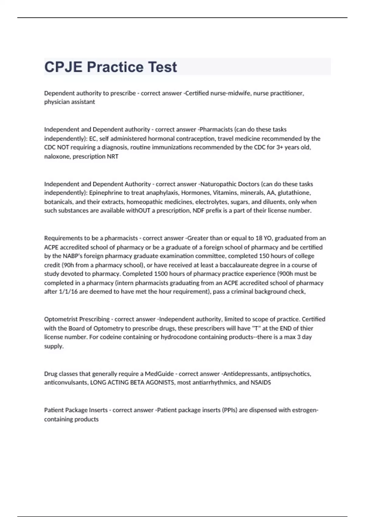 Dependent authority to prescribe - correct answer -Certified nurse-midwife, nurse practitioner, physician assistant Independent and Dependent authority - correct answer -Pharmacists (can do these tasks independently): EC, self administered hormonal contraception, travel medicine recommended by the CDC NOT requiring a diagnosis, routine immunizations recommended by the CDC for 3+ years old, naloxone, prescription NRT Independent and Dependent Authority - correct answer -Naturopathic Doctors (can do these tasks independently): Epinephrine to treat anaphylaxis, Hormones, Vitamins, minerals, AA, glutathione, botanicals, and their extracts, homeopathic medicines, electrolytes, sugars, and diluents, only when such substances are available withOUT a prescription, NDF prefix is a part of their license number. Requirements to be a pharmacists - correct answer -Greater than or equal to 18 YO, graduated from an ACPE accredited school of pharmacy or be a graduate of a foreign school of pharmacy and be certified by the NABP's foreign pharmacy graduate examination committee, completed 150 hours of college credit (90h from a pharmacy school), or have received at least a baccalaureate degree in a course of study devoted to pharmacy. Completed 1500 hours of pharmacy practice experience (900h must be completed in a pharmacy (intern pharmacists graduating from an ACPE accredited school of pharmacy after 1/1/16 are deemed to have met the hour requirement), pass a criminal background check, Optometrist Prescribing - correct answer -Independent authority, limited to scope of practice. Certified with the Board of Optometry to prescribe drugs, these prescribers will have "T" at the END of thier license number. For codeine containing or hydrocodone containing products--there is a max 3 day supply. Drug classes that generally require a MedGuide - correct answer -Antidepressants, antipsychotics, anticonvulsants, LONG ACTING BETA AGONISTS, most antiarrhythmics, and NSAIDS Patient Package Inserts - correct answer -Patient package inserts (PPIs) are dispensed with estrogen-containing products Moral Convictions - correct answer -A pharmacy can refuse to hire someone that chooses not to dispense medications based on moral convictions Reconstitution Systems - correct answer -ADD-Vantage system, Mini-bag plus system, addEASE Not considered compoun