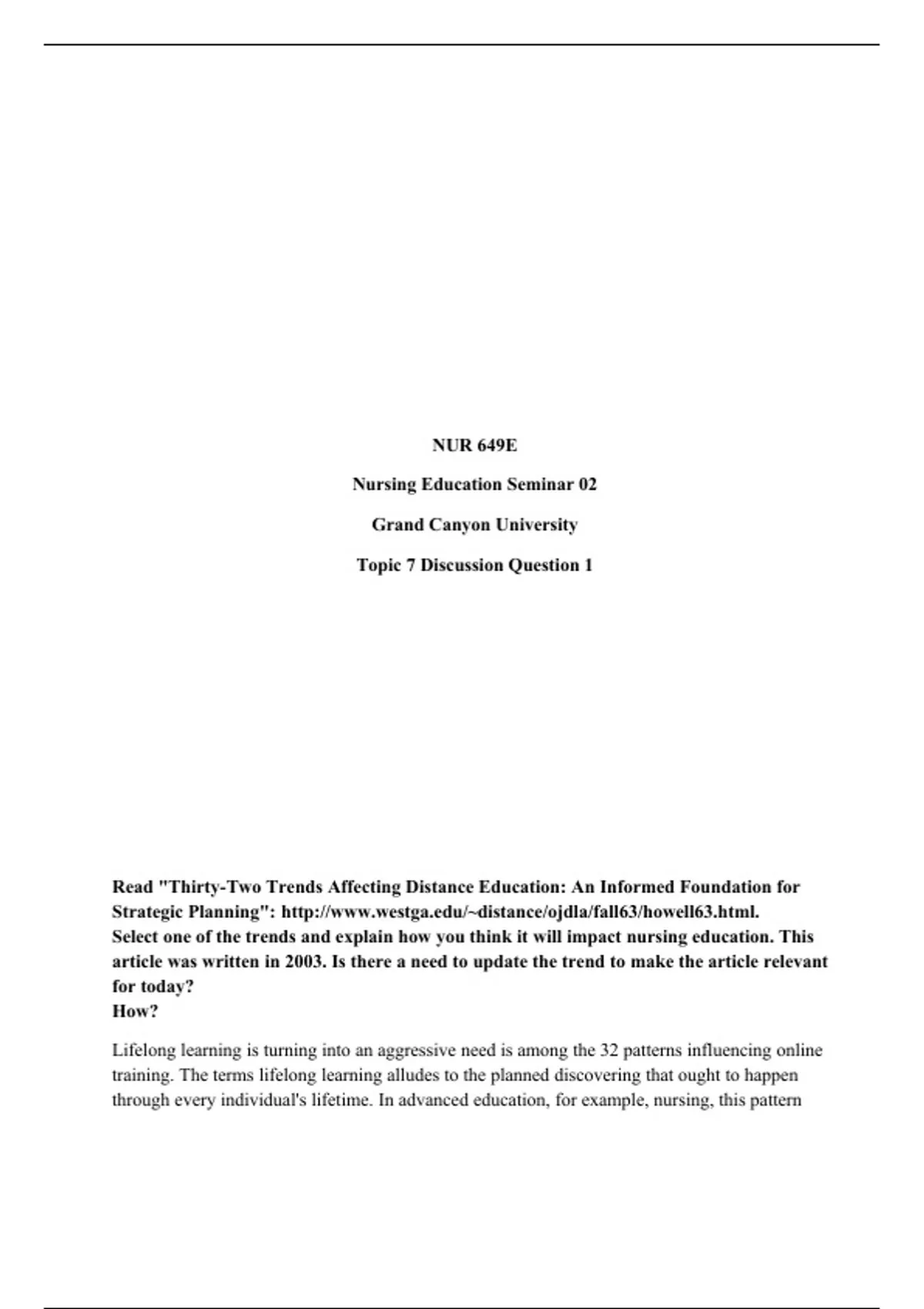 NUR 649E (Nursing Education Seminar 02) Topic 7 Discussion Question 1 Description Read "Thirty-Two Trends Affecting Distance Education: An Informed Foundation for Strategic Planning": Select one of the trends and explain how you think it will impact nursing education. This article was written in 2003. Is there a need to update the trend to make the article relevant for today? How?