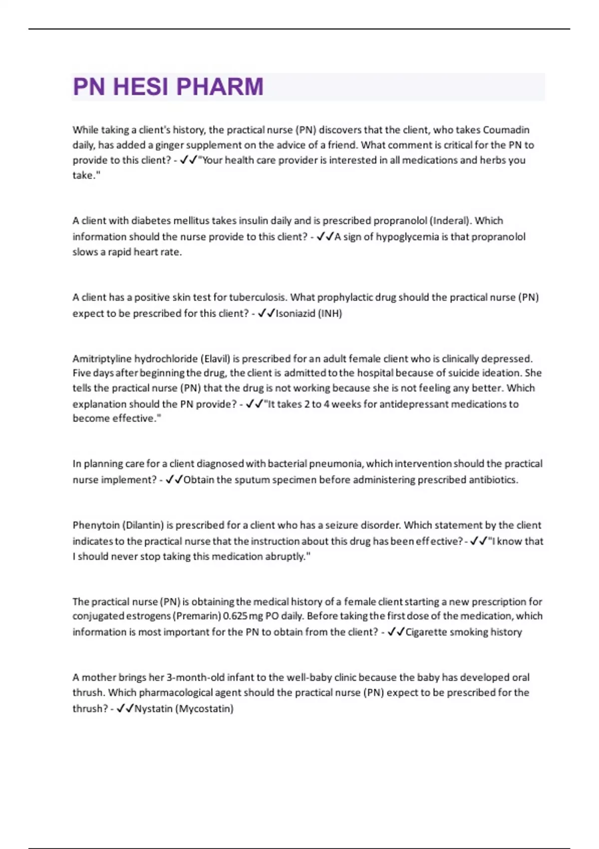 While taking a client's history, the practical nurse (PN) discovers that the client, who takes Coumadin daily, has added a ginger supplement on the advice of a friend. What comment is critical for the PN to provide to this client? - "Your health care provider is interested in all medications and herbs you take." A client with diabetes mellitus takes insulin daily and is prescribed propranolol (Inderal). Which information should the nurse provide to this client? - A sign of hypoglycemia is that propranolol slows a rapid heart rate. A client has a positive skin test for tuberculosis. What prophylactic drug should the practical nurse (PN) expect to be prescribed for this client? - Isoniazid (INH) Amitriptyline hydrochloride (Elavil) is prescribed for an adult female client who is clinically depressed. Five days after beginning the drug, the client is admitted to the hospital because of suicide ideation. She tells the practical nurse (PN) that the drug is not working because she is not feeling any better. Which explanation should the PN provide? - "It takes 2 to 4 weeks for antidepressant medications to become effective." In planning care for a client diagnosed with bacterial pneumonia, which intervention should the practical nurse implement? - Obtain the sputum specimen before administering prescribed antibiotics. Phenytoin (Dilantin) is prescribed for a client who has a seizure disorder. Which statement by the client indicates to the practical nurse that the instruction about this drug has been effective? - "I know that I should never stop taking this medication abruptly." The practical nurse (PN) is obtaining the medical history of a female client starting a new prescription for conjugated estrogens (Premarin) 0.625 mg PO daily. Before taking the first dose of the medication, which information is most important for the PN to obtain from the client? - Cigarette smoking history A mother brings her 3-month-old infant to the well-baby clinic because the baby has developed oral thrush. Which pharmacological agent should the practical nurse (PN) expect to be prescribed for the thrush? - Nystatin (Mycostatin)