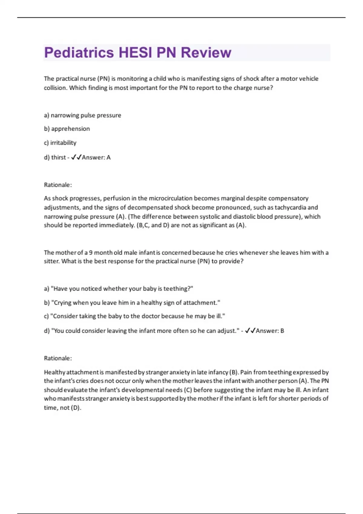 The practical nurse (PN) is monitoring a child who is manifesting signs of shock after a motor vehicle collision. Which finding is most important for the PN to report to the charge nurse? a) narrowing pulse pressure b) apprehension c) irritability d) thirst - Answer: A Rationale: As shock progresses, perfusion in the microcirculation becomes marginal despite compensatory adjustments, and the signs of decompensated shock become pronounced, such as tachycardia and narrowing pulse pressure (A). (The difference between systolic and diastolic blood pressure), which should be reported immediately. (B,C, and D) are not as significant as (A). The mother of a 9 month old male infant is concerned because he cries whenever she leaves him with a sitter. What is the best response for the practical nurse (PN) to provide? a) "Have you noticed whether your baby is teething?" b) "Crying when you leave him in a healthy sign of attachment." c) "Consider taking the baby to the doctor because he may be ill." d) "You could consider leaving the infant more often so he can adjust." - Answer: B Rationale: Healthy attachment is manifested by stranger anxiety in late infancy (B). Pain from teething expressed by the infant's cries does not occur only when the mother leaves the infant with another person (A). The PN should evaluate the infant's developmental needs (C) before suggesting the infant may be ill. An infant who manifests stranger anxiety is best supported by the mother if the infant is left for shorter periods of time, not (D).Which preoperative action is most important for the practical nurse (PN) to implement for a newborn with meningomyelocele? a) document vital signs b) prevent skin breakdown c) minimize the risk for infection d) monitor neurologic functioning - Answer: C