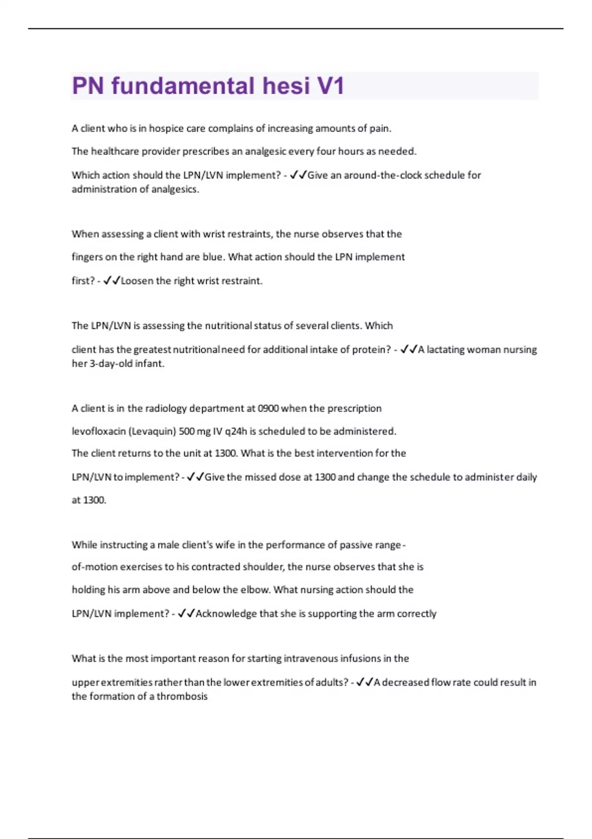 A client who is in hospice care complains of increasing amounts of pain. The healthcare provider prescribes an analgesic every four hours as needed. Which action should the LPN/LVN implement? - Give an around-the-clock schedule for administration of analgesics. When assessing a client with wrist restraints, the nurse observes that the fingers on the right hand are blue. What action should the LPN implement first? - Loosen the right wrist restraint. The LPN/LVN is assessing the nutritional status of several clients. Which client has the greatest nutritional need for additional intake of protein? - A lactating woman nursing her 3-day-old infant. A client is in the radiology department at 0900 when the prescription levofloxacin (Levaquin) 500 mg IV q24h is scheduled to be administered. The client returns to the unit at 1300. What is the best intervention for the LPN/LVN to implement? - Give the missed dose at 1300 and change the schedule to administer daily at 1300. While instructing a male client's wife in the performance of passive rangeof-motion exercises to his contracted shoulder, the nurse observes that she is holding his arm above and below the elbow. What nursing action should the LPN/LVN implement? - Acknowledge that she is supporting the arm correctly What is the most important reason for starting intravenous infusions in the upper extremities rather than the lower extremities of adults? - A decreased flow rate could result in the formation of a thrombosisThe LPN observes an unlicensed assistive personnel (UAP) taking a client's blood pressure with a cuff that is too small, but the blood pressure reading obtained is within the client's usual range. What action is most important for the nurse to implement? - Reassess the client's blood pressure using a larger cuff