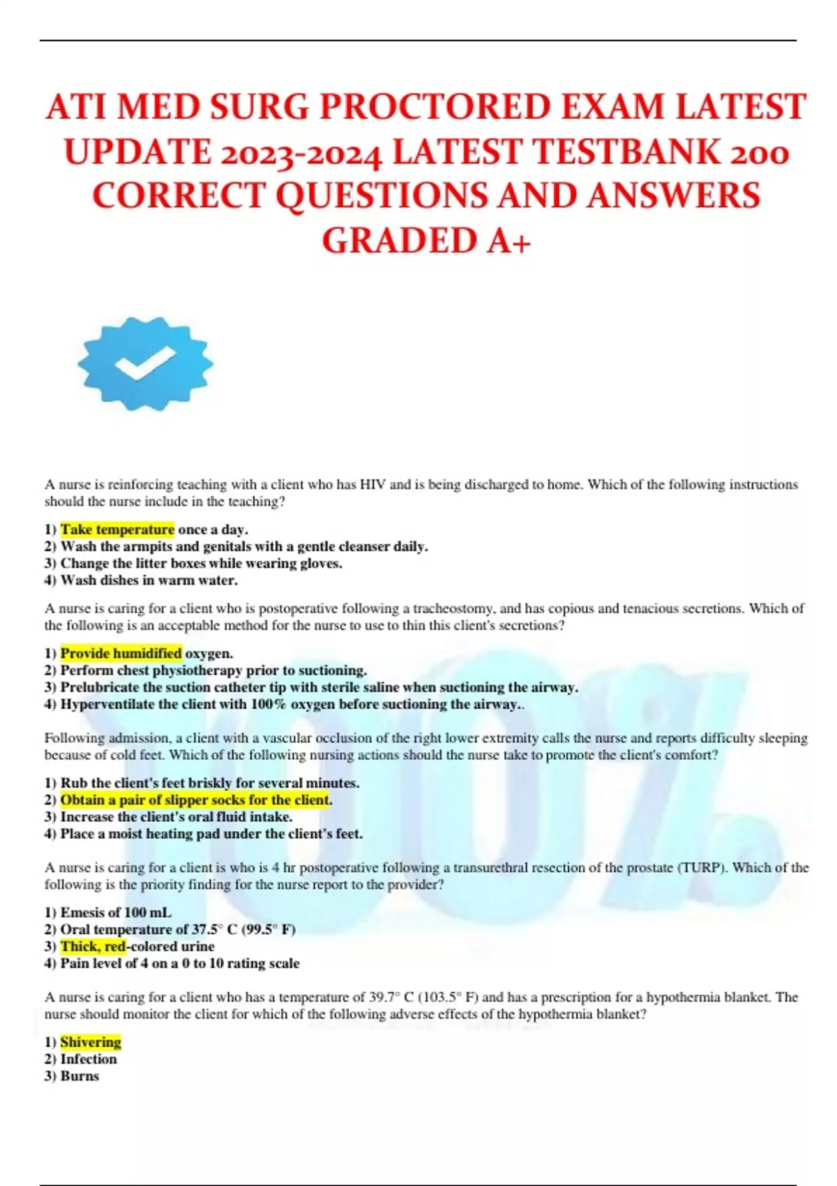 ATI MEDICAL SUR ICAL PROCTORED EXAMS CORRECT 2023-2024 ATI MED-SURG PROCTORED EXAM 2023-2024