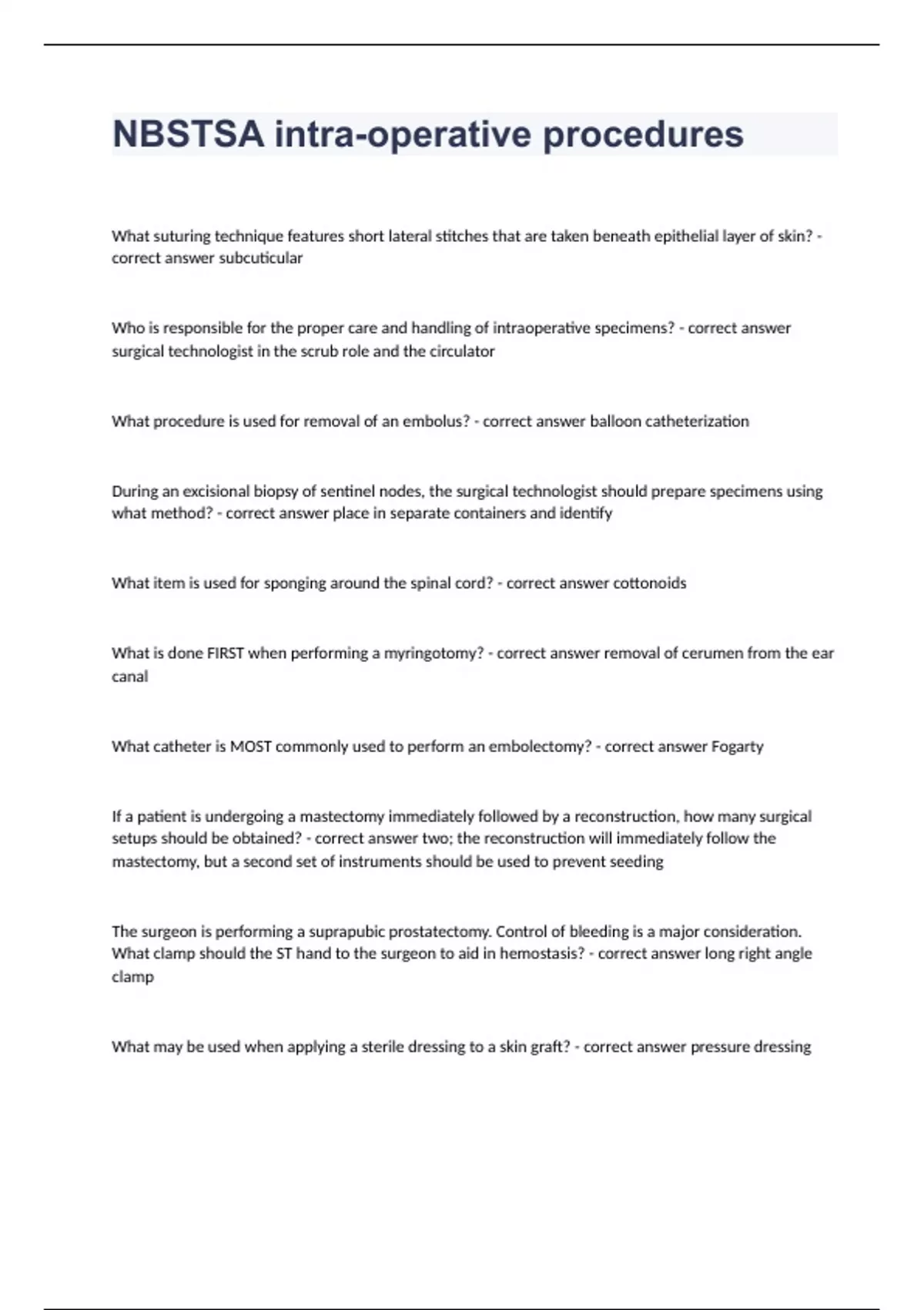 NBSTSA intra-operative proceduresWhat suturing technique features short lateral stitches that are taken beneath epithelial layer of skin? subcuticular Who is responsible for the proper care and handling of intraoperative specimens? surgical technologist in the scrub role and the circulator What procedure is used for removal of an embolus? balloon catheterization During an excisional biopsy of sentinel nodes, the surgical technologist should prepare specimens using what method? place in separate containers and identify What item is used for sponging around the spinal cord? cottonoids What is done FIRST when performing a myringotomy? removal of cerumen from the ear canal What catheter is MOST commonly used to perform an embolectomy? Fogarty If a patient is undergoing a mastectomy immediately followed by a reconstruction, how many surgical setups should be obtained? two; the reconstruction will immediately follow the mastectomy, but a second set of instruments should be used to prevent seeding The surgeon is performing a suprapubic prostatectomy. Control of bleeding is a major consideration. What clamp should the ST hand to the surgeon to aid in hemostasis? long right angle clamp What may be used when applying a sterile dressing to a skin graft? pressure dressing What is NOT symptom of shock? -Increased respirations -Hypertension -Cold, clammy skin -Tachycardia hypertension A surgeon asks for warm irrigation after a GI tract re-anastomosis. What BEST describes the reason for irrigating at this point in the procedure? to aid visual inspection for leakage