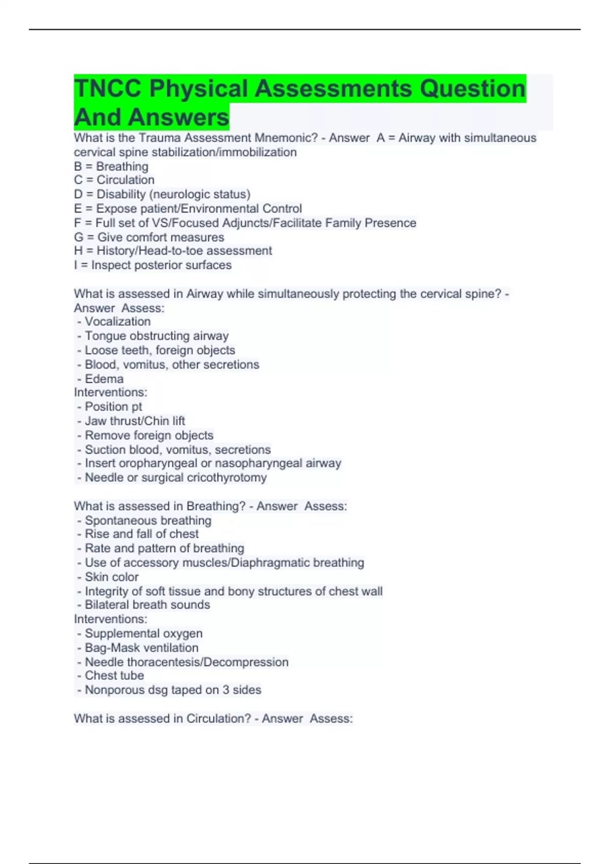 What is the Trauma Assessment Mnemonic? - Answer A = Airway with simultaneous cervical spine stabilization/immobilization B = Breathing C = Circulation D = Disability (neurologic status) E = Expose patient/Environmental Control F = Full set of VS/Focused Adjuncts/Facilitate Family Presence G = Give comfort measures H = History/Head-to-toe assessment I = Inspect posterior surfaces What is assessed in Airway while simultaneously protecting the cervical spine? - Answer Assess: - Vocalization - Tongue obstructing airway - Loose teeth, foreign objects - Blood, vomitus, other secretions - Edema Interventions: - Position pt - Jaw thrust/Chin lift - Remove foreign objects - Suction blood, vomitus, secretions - Insert oropharyngeal or nasopharyngeal airway - Needle or surgical cricothyrotomy What is assessed in Breathing? - Answer Assess: - Spontaneous breathing - Rise and fall of chest - Rate and pattern of breathing - Use of accessory muscles/Diaphragmatic breathing - Skin color - Integrity of soft tissue and bony structures of chest wall - Bilateral breath sounds Interventions: - Supplemental oxygen - Bag-Mask ventilation - Needle thoracentesis/Decompression - Chest tube - Nonporous dsg taped on 3 sides What is assessed in Circulation? - Answer Assess: - Palpates central