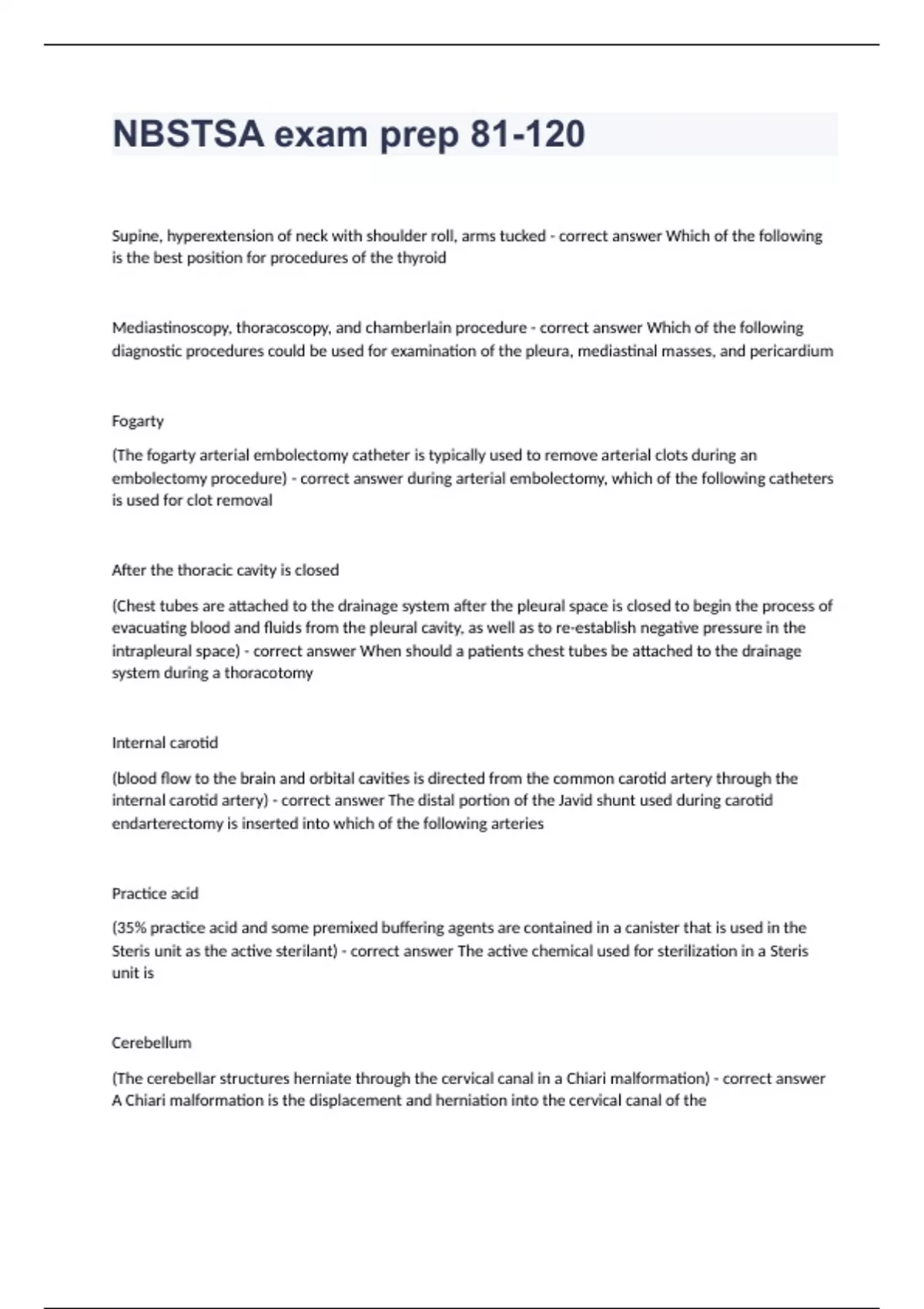 NBSTSA exam prep 81-120Supine, hyperextension of neck with shoulder roll, arms tucked Which of the following is the best position for procedures of the thyroid Mediastinoscopy, thoracoscopy, and chamberlain procedure Which of the following diagnostic procedures could be used for examination of the pleura, mediastinal masses, and pericardium Fogarty (The fogarty arterial embolectomy catheter is typically used to remove arterial clots during an embolectomy procedure) during arterial embolectomy, which of the following catheters is used for clot removal After the thoracic cavity is closed (Chest tubes are attached to the drainage system after the pleural space is closed to begin the process of evacuating blood and fluids from the pleural cavity, as well as to re-establish negative pressure in the intrapleural space) When should a patients chest tubes be attached to the drainage system during a thoracotomy Internal carotid (blood flow to the brain and orbital cavities is directed from the common carotid artery through the internal carotid artery) The distal portion of the Javid shunt used during carotid endarterectomy is inserted into which of the following arteries Practice acid (35% practice acid and some premixed buffering agents are contained in a canister that is used in the Steris unit as the active sterilant) The active chemical used for sterilization in a Steris unit is Cerebellum (The cerebellar structures herniate through the cervical canal in a Chiari malformation) A Chiari malformation is the displacement and herniation into the cervical canal of the Fissure of Rolando (The fissure of rolando is an anatomical landmark that separates the frontal and parietal lobes and is clinically important because the convolution in front of it contains the center for control of movements for the opposite side of the body) Which of the following anatomical landmarks separates the frontal and parietal lobes and is clinically important because its anterior convolution contains the center for ipsilateral motor control. Papaverine (Papaverine stops spasming and relaxes smooth muscles, especially those of large arteries) During cardiac arterial bypass grafting, a surgeon needs to vasodilate and stop arterial spasm. Which of the following drugs should be used Potency of the airway is the prime concern when positioning the patient, Pressure injuries are most common after surgical procedures lasting one hour or longer, The most common sites of peripheral nerve injury are the divisions of the brachial plexus and the ulnar, radial, peroneal and facial nerves Which of the following should be considered when positioning a patient