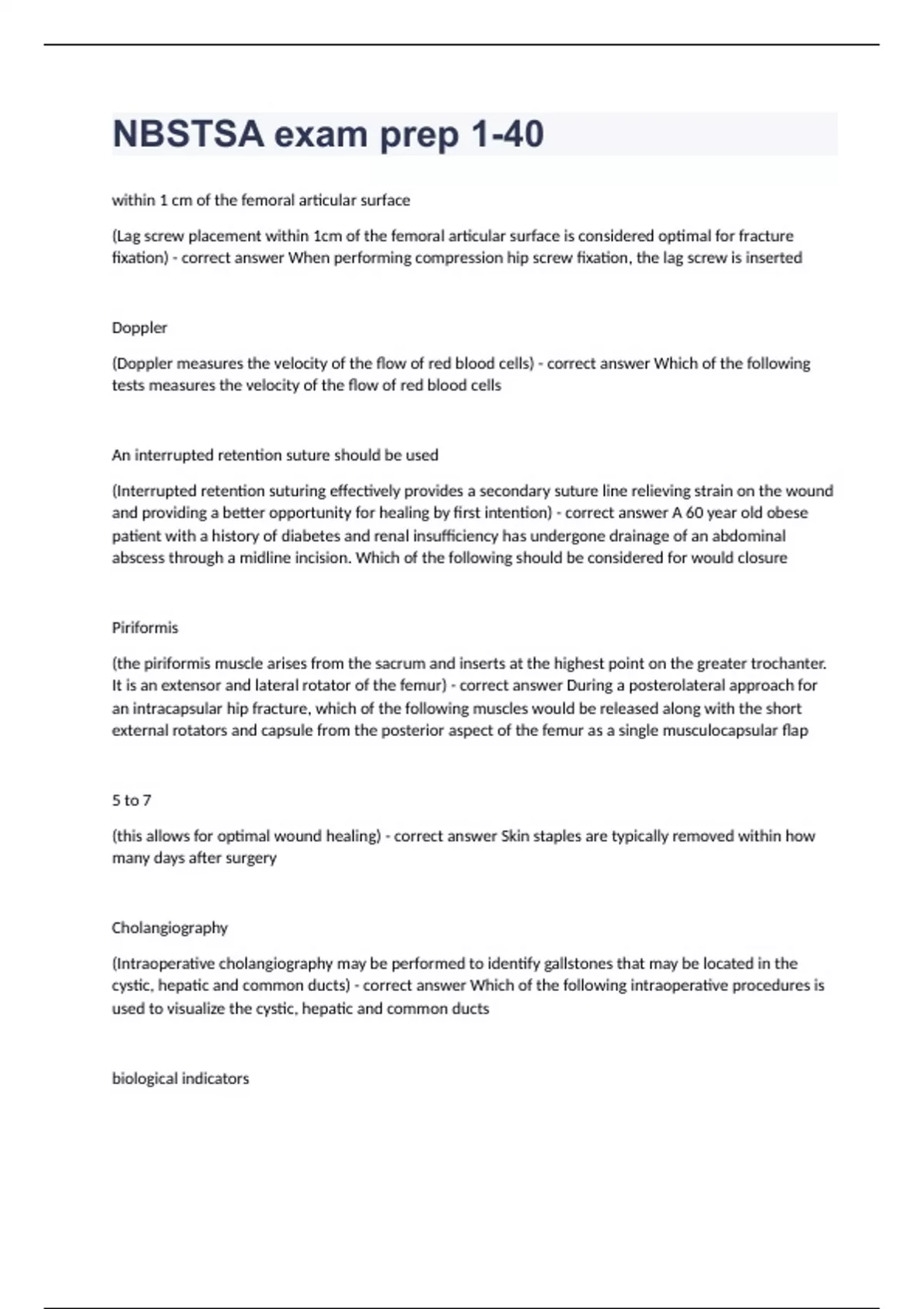 NBSTSA exam prep 1-40within 1 cm of the femoral articular surface (Lag screw placement within 1cm of the femoral articular surface is considered optimal for fracture fixation) When performing compression hip screw fixation, the lag screw is inserted Doppler (Doppler measures the velocity of the flow of red blood cells) Which of the following tests measures the velocity of the flow of red blood cells An interrupted retention suture should be used (Interrupted retention suturing effectively provides a secondary suture line relieving strain on the wound and providing a better opportunity for healing by first intention) A 60 year old obese patient with a history of diabetes and renal insufficiency has undergone drainage of an abdominal abscess through a midline incision. Which of the following should be considered for would closure Piriformis (the piriformis muscle arises from the sacrum and inserts at the highest point on the greater trochanter. It is an extensor and lateral rotator of the femur) During a posterolateral approach for an intracapsular hip fracture, which of the following muscles would be released along with the short external rotators and capsule from the posterior aspect of the femur as a single musculocapsular flap 5 to 7 (this allows for optimal wound healing) Skin staples are typically removed within how many days after surgery Cholangiography (Intraoperative cholangiography may be performed to identify gallstones that may be located in the cystic, hepatic and common ducts) Which of the following intraoperative procedures is used to visualize the cystic, hepatic and common ducts biological indicators (positive assurance that sterilization conditions have been achieved can only be obtained through a biological control test) Positive assurance that sterilization conditions have been achieved can only be obtained through Reduce the possibility of carpal tunnel syndrome postoperatively (Transecting the transverse carpal ligament is routinely done during an ORIF of a distal radius. It is performed during this procedure to minimize the possibility of carpal tunnel syndrome postoperatively due to swelling) During an ORIF of the distal radius, the surgeon may transect the transverse carpal ligament to hepatoduodenal (The hepatoduodenal ligament is also known as the port hepatic and contains the common bile duct, hepatic artery, and portal vein) During a cholecystectomy, it is important to isolate which of the following ligaments, consisting of the common bile duct, hepatic artery, and portal vein