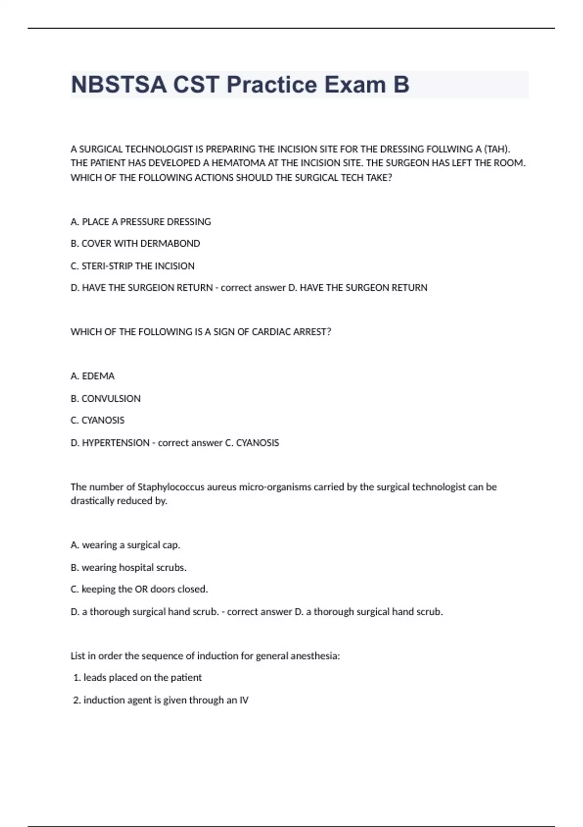 NBSTSA CST Practice Exam BA SURGICAL TECHNOLOGIST IS PREPARING THE INCISION SITE FOR THE DRESSING FOLLWING A (TAH). THE PATIENT HAS DEVELOPED A HEMATOMA AT THE INCISION SITE. THE SURGEON HAS LEFT THE ROOM. WHICH OF THE FOLLOWING ACTIONS SHOULD THE SURGICAL TECH TAKE? A. PLACE A PRESSURE DRESSING B. COVER WITH DERMABOND C. STERI-STRIP THE INCISION D. HAVE THE SURGEION RETURN D. HAVE THE SURGEON RETURN WHICH OF THE FOLLOWING IS A SIGN OF CARDIAC ARREST? A. EDEMA B. CONVULSION C. CYANOSIS D. HYPERTENSION C. CYANOSIS The number of Staphylococcus aureus micro-organisms carried by the surgical technologist can be drastically reduced by. A. wearing a surgical cap. B. wearing hospital scrubs. C. keeping the OR doors closed. D. a thorough surgical hand scrub. D. a thorough surgical hand scrub. List in order the sequence of induction for general anesthesia: 1. leads placed on the patient 2. induction agent is given through an IV 3. patient is prompted to breathe 100% oxygen 4. patient is intubated 5. anesthetic gas agent is selected and applied A. 1, 3, 5, 4, and 2 B. 5, 2, 3, 1, and 4 C. 1, 3, 2, 4, and 5 D. 4, 2, 3, 1, and 5 C. 1, 3, 2, 4, and 5 Place the following phases of wound healing by first intention in correct order from first to last: I. proliferation II. remodeling III. inflammatory A. I, II, III B. II, I, III C. III, I, II D. III, II, I C. III, I, II A surgical technologist has selected the sutures for a procedure based on the surgeon's preference card. The surgeon states he would like additional sutures and his preference card is outdated. Which of the following is the surgical technologist's BEST course of action? A. Open all of the sutures that were collected and place them on the back table just in case the surgeon needs them. B. Return the sutures that are not needed to sterile supply and proceed with the case. C. Ask the surgeon if he would like to have his preference card updated and proceed accordingly. D. Update the surgeon's preference card to reflect the sutures that have been requested for this case. C. Ask the surgeon if he would like to have his preference card updated and proceed accordingly.